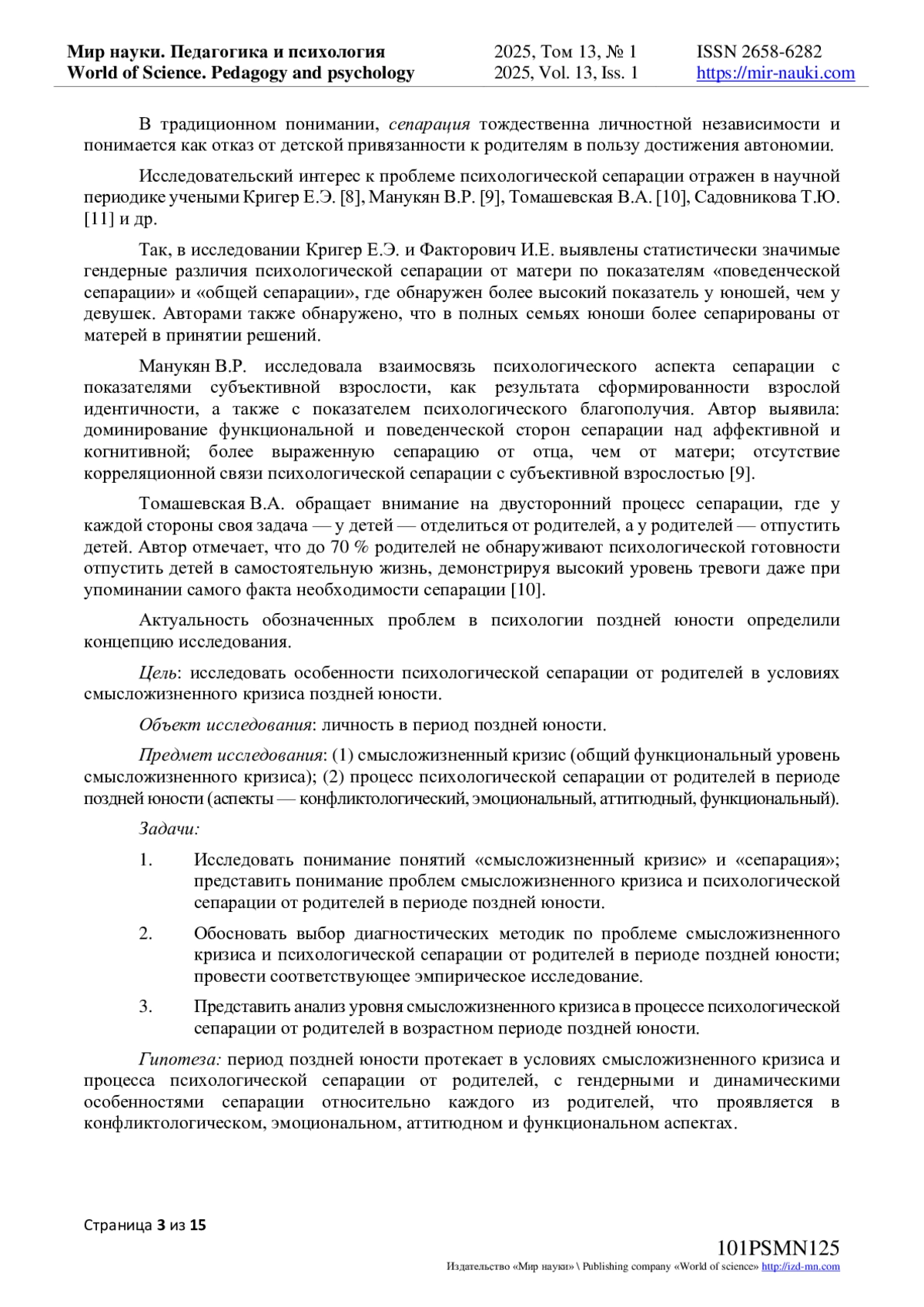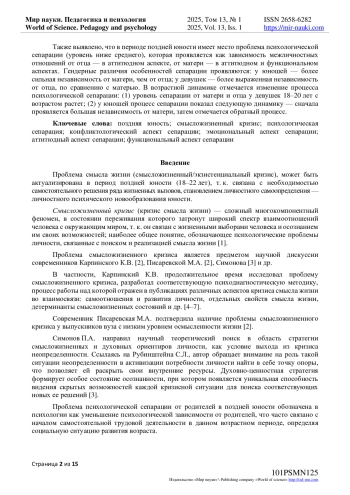 В статье рассматривается феномен психологической сепарации от родителей как ключевой фактор личностного развития и психологического благополучия в период ранней взрослости. Представлен интегративный анализ основных теоретических подходов к пониманию сепарации: психоаналитического, фокусирующегося на интрапсихических процессах отделения от инфантильных объектов; теории привязанности, исследующей трансформацию детско-родительских отношений; системного семейного подхода, изучающего структуру и динамику семейных взаимодействий. Обосновывается роль успешной сепарации в достижении личностной зрелости, проявляющейся в самодетерминации, аутентичности, способности к глубоким межличностным отношениям. Выявлена связь характера сепарации с формированием идентичности, локуса контроля, копинг-стратегий. Описаны нарушения сепарации, проявляющиеся в размытости личностных границ, эмоциональной зависимости, трудностях автономного функционирования. Особое внимание уделяется современному социокультурному контексту, характеризующемуся феноменом «удлиненного взросления», когда молодые люди дольше сохраняют зависимость от родителей. Представлены результаты эмпирических исследований, демонстрирующие вариативность индивидуальных траекторий сепарации: от здоровой автономии до дисфункциональных паттернов зависимости или псевдонезависимости. Показано влияние типа сепарации на качество супружеских отношений и психологического благополучия молодых людей. Подчеркивается значимость комплексного подхода к изучению сепарации, учитывающего как внутрисемейные факторы (особенности детско-родительских отношений, тип семейной структуры), так и социокультурные аспекты (традиционный или современный тип общества). Намечены перспективы дальнейших исследований в области типологизации вариантов «вхождения во взрослость» и разработки программ психологической помощи молодым людям в процессе сепарации.