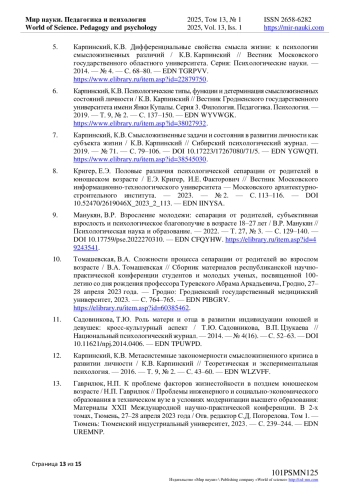 7. Карпинский, К.В. Смысложизненные задачи и состояния в развитии личности как субъекта жизни / К.В. Карпинский // Сибирский психологический журнал. - 2019. - № 71. - С. 79-106. item.asp?id=38545030. DOI: 10.17223/17267080/71/5 EDN: YGWQTI