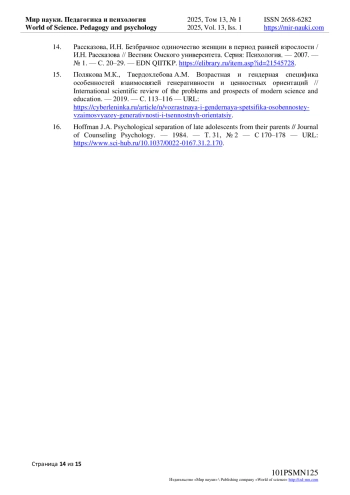 14. Рассказова, И.Н. Безбрачное одиночество женщин в период ранней взрослости / И.Н. Рассказова // Вестник Омского университета. Серия: Психология. - 2007. - № 1. - С. 20-29. item.asp?id=21545728. EDN: QIITKP