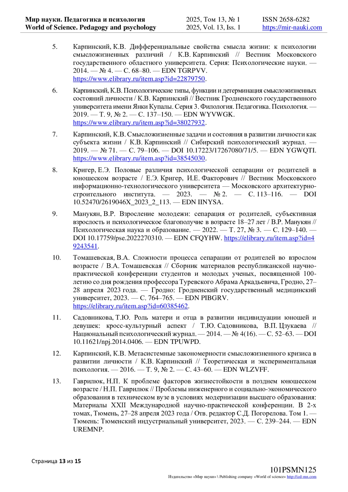 12. Карпинский, К.В. Метасистемные закономерности смысложизненного кризиса в развитии личности / К.В. Карпинский // Теоретическая и экспериментальная психология. - 2016. - Т. 9, № 2. - С. 43-60. EDN: WLZVFF