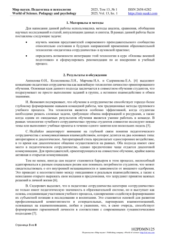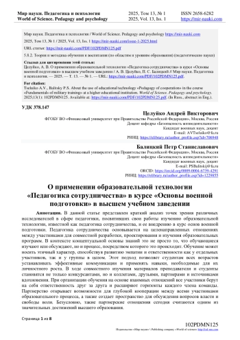 В данной статье представлен краткий анализ точек зрения различных исследователей в сфере педагогики, посвятивших свои работы изучению образовательной технологии, известной как педагогика сотрудничества, и ее внедрению в курс основ военной подготовки. Педагогика сотрудничества основывается на целенаправленных отношениях между участниками для совместной разработки, проектирования и изучения образовательных программ. В контексте концептуальной основы знаний это не просто то, что обучающиеся изучают или обсуждают, но и процесс, посредством которого это происходит. Обучение может носить этичный характер, способствуя развитию эмпатии и ответственности как у отдельных участников, так и у группы в целом. Этот подход позволяет студентам всех возрастов устанавливать эффективные коммуникации и применять навыки, необходимые для их личностного роста. В ходе совместного изучения материалов преподаватели и студенты становятся не только конкурсантами, но и коллегами, друзьями, партнерами и источниками вдохновения. При организации обучения на основе взаимных отношений все участники берут на себя ответственность друг за друга и расширяют горизонты каждого члена команды. Партнерство открывает возможности для глубокой кооперации между всеми участниками образовательного процесса, а также создает пространство для обсуждения вопросов власти и свободы воли. Безусловно, такие партнерские отношения сегодня считаются одним из значительных достижений высшего образования.