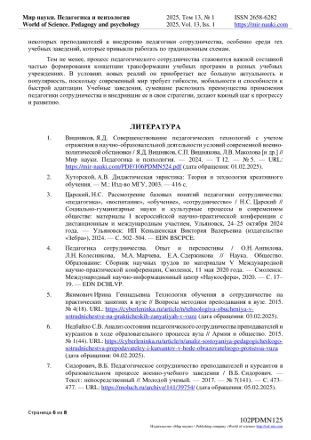 1. Вишняков, Я.Д. Совершенствование педагогических технологий с учетом отражения в научно-образовательной деятельности условий современной военно-политической обстановки / Я.Д. Вишняков, С.П. Вишнякова, Л.В. Маколова [и др.] // Мир науки. Педагогика и психология. - 2024. - Т 12. - № 5. - URL: https://mir-nauki.com/PDF/106PDMN524.pdf (дата обращения: 01.02.2025).