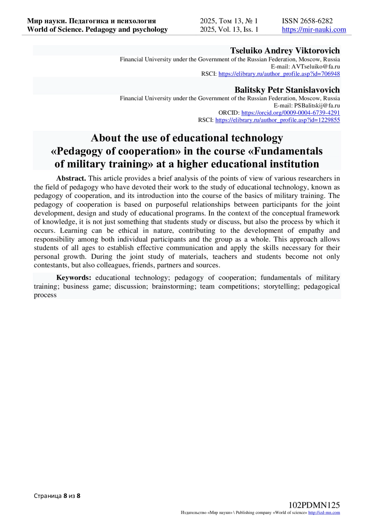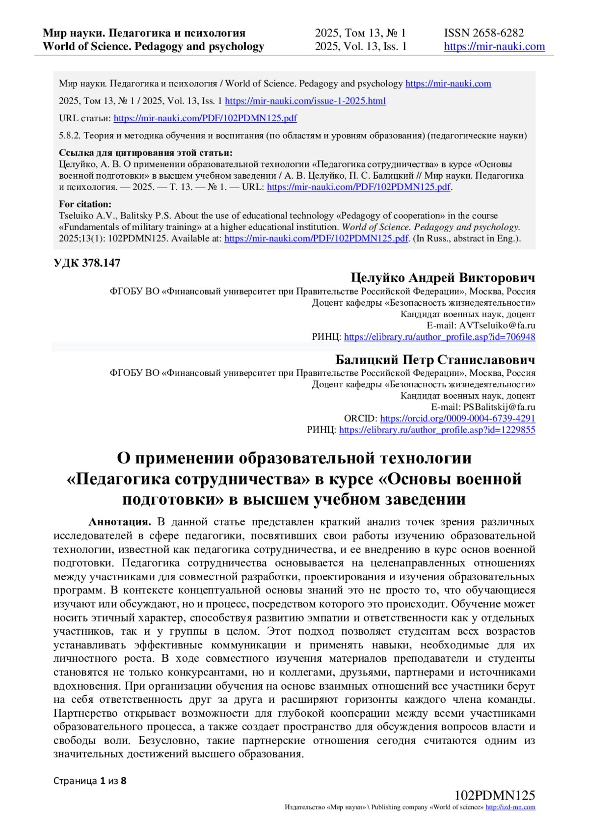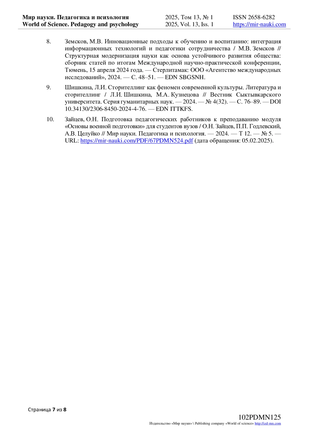 10. Зайцев, О.Н. Подготовка педагогических работников к преподаванию модуля “Основы военной подготовки” для студентов вузов / О.Н. Зайцев, П.П. Годлевский, А.В. Целуйко // Мир науки. Педагогика и психология. - 2024. - Т 12. - № 5. - URL: https://mir-nauki.com/PDF/67PDMN524.pdf (дата обращения: 05.02.2025).