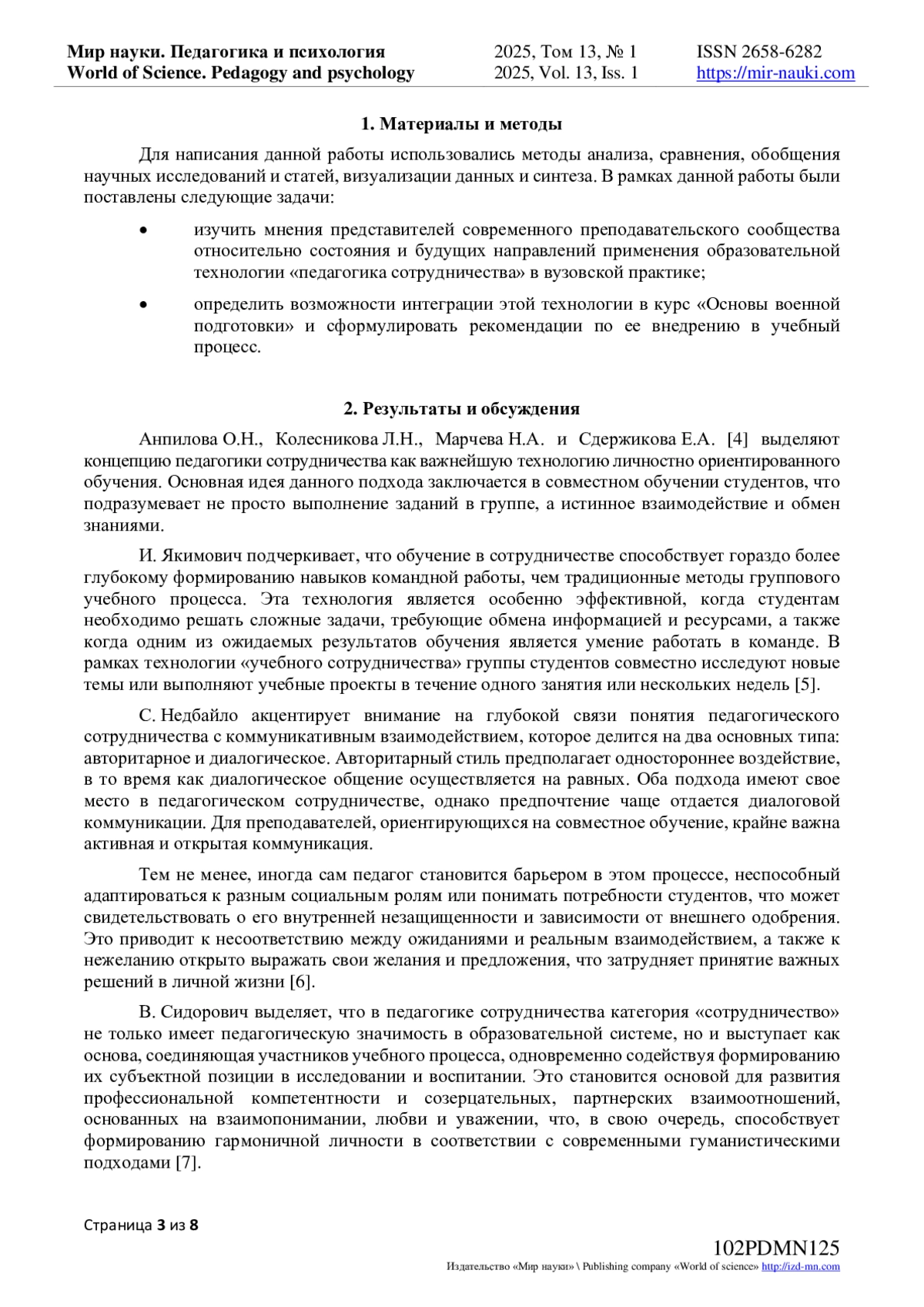 4. Педагогика сотрудничества. Опыт и перспективы / О.Н. Анпилова, Л.Н. Колесникова, М.А. Марчева, Е.А. Сдержикова // Наука. Общество. Образование: Сборник научных трудов по материалам V Международной научно-практической конференции, Смоленск, 11 мая 2020 года. - Смоленск: Международный научно-информационный центр “Наукосфера”, 2020. - С. 17-19. EDN: DCHLVP