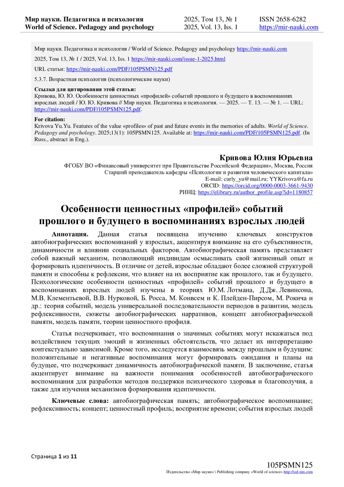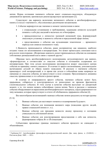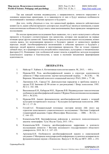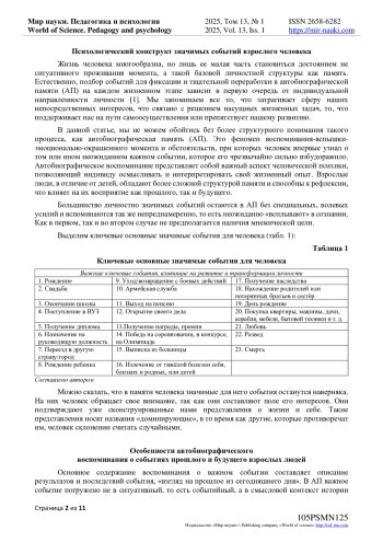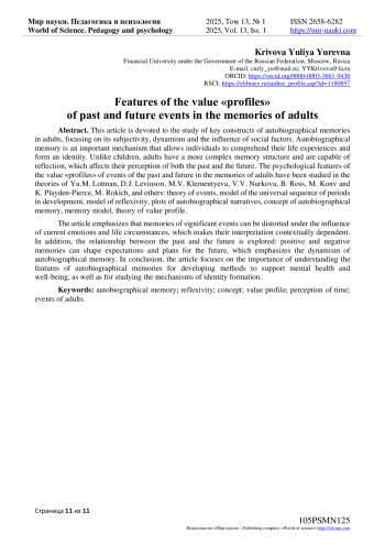 Данная статья посвящена изучению ключевых конструктов автобиографических воспоминаний у взрослых, акцентируя внимание на его субъективности, динамичности и влиянии социальных факторов. Автобиографическая память представляет собой важный механизм, позволяющий индивидам осмысливать свой жизненный опыт и формировать идентичность. В отличие от детей, взрослые обладают более сложной структурой памяти и способны к рефлексии, что влияет на их восприятие как прошлого, так и будущего. Психологические особенности ценностных «профилей» событий прошлого и будущего в воспоминаниях взрослых людей изучены в теориях Ю. М. Лотмана, Д. Дж. Левинсона, М. В. Клементьевой, В. В. Нурковой, Б. Росса, М. Конвсем и К. Плейден-Пирсом, М. Рокича и др.: теория событий, модель универсальной последовательности периодов в развитии, модель рефлексивности, сюжеты автобиографических нарративов, концепт автобиографической памяти, модель памяти, теории ценностного профиля. Статья подчеркивает, что воспоминания о значимых событиях могут искажаться под воздействием текущих эмоций и жизненных обстоятельств, что делает их интерпретацию контекстуально зависимой. Кроме того, исследуется взаимосвязь между прошлым и будущим: положительные и негативные воспоминания могут формировать ожидания и планы на будущее, что подчеркивает динамичность автобиографической памяти. В заключение, статья акцентирует внимание на важности понимания особенностей автобиографического воспоминания для разработки методов поддержки психического здоровья и благополучия, а также для изучения механизмов формирования идентичности.