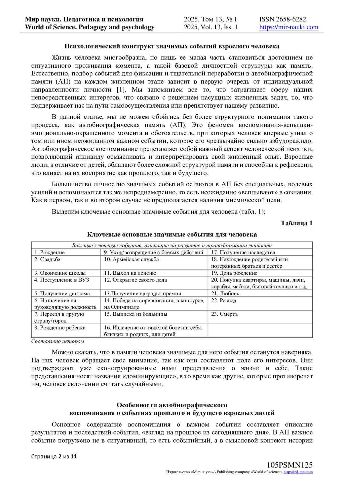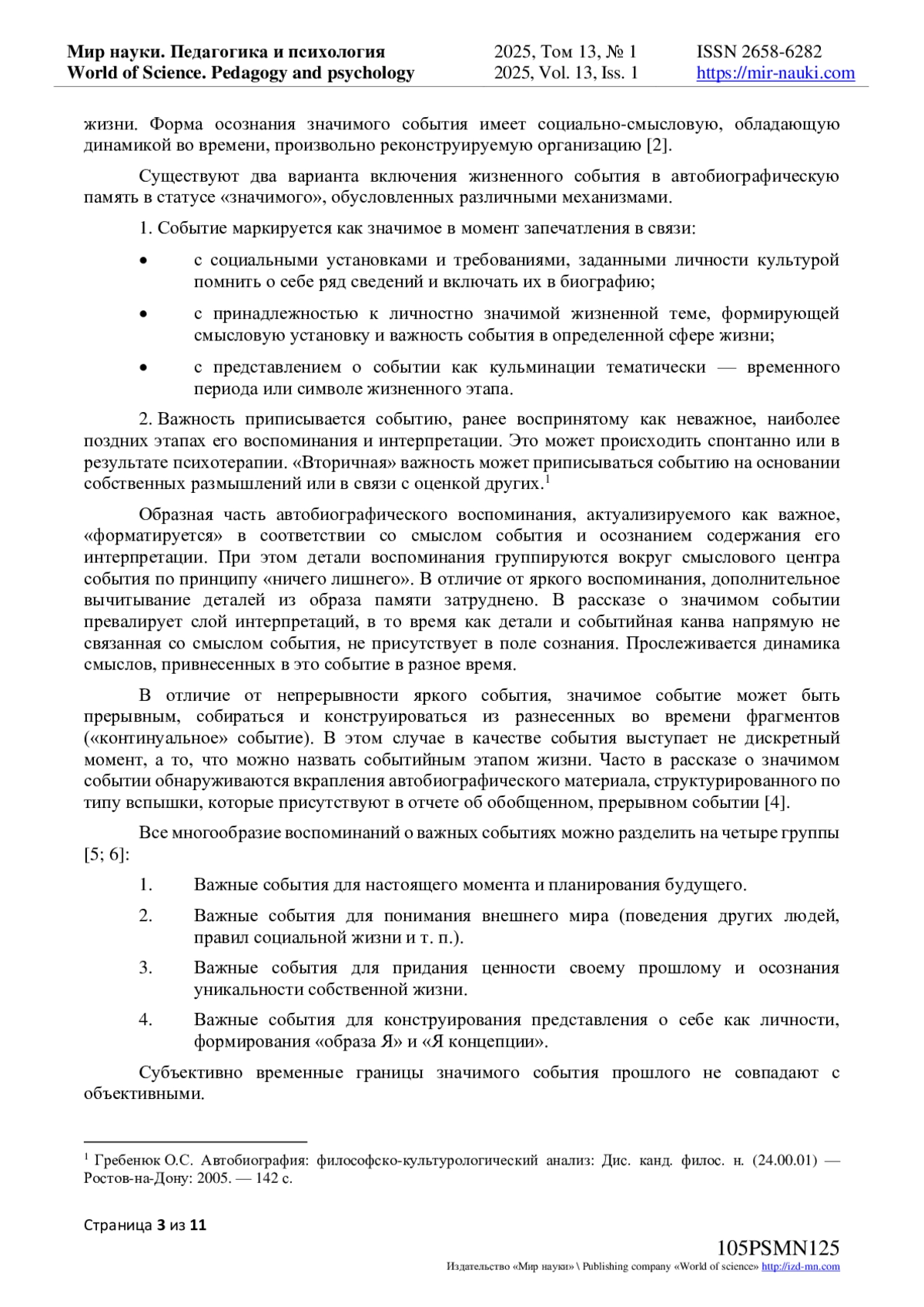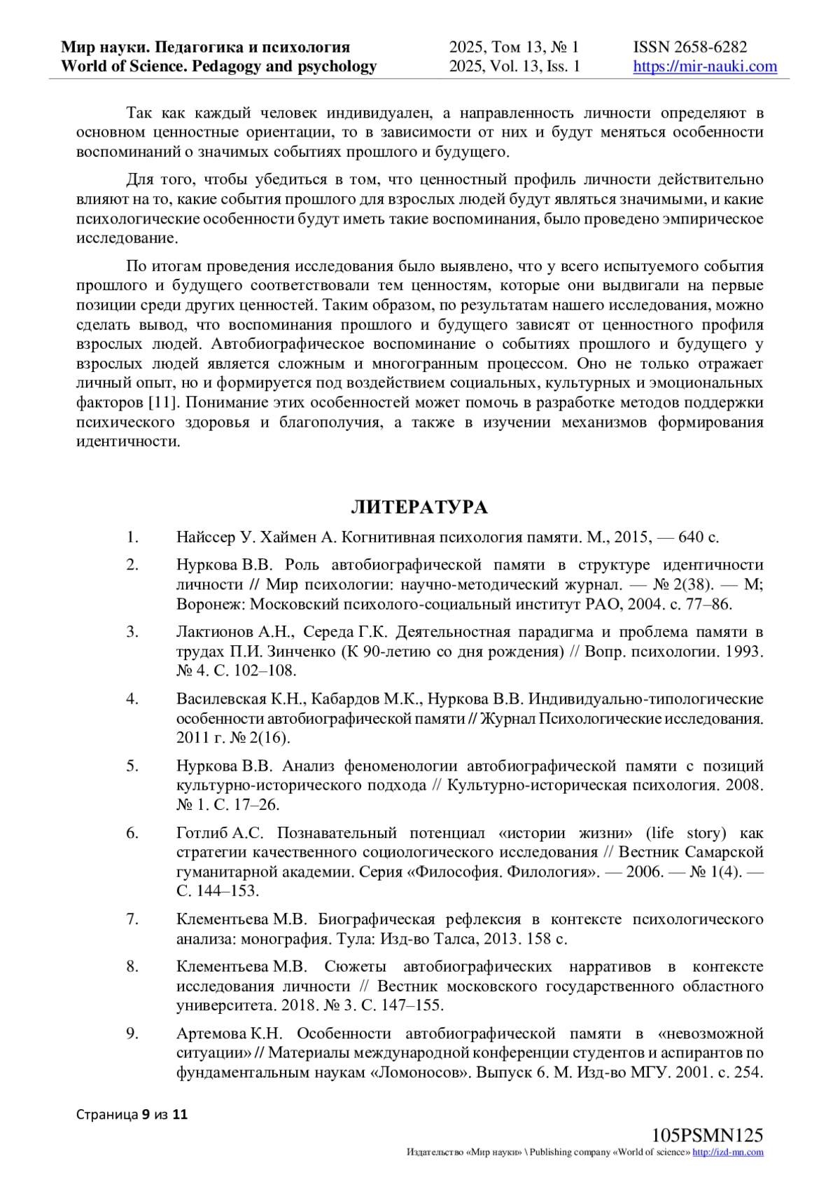 2. Нуркова В.В. Роль автобиографической памяти в структуре идентичности личности // Мир психологии: научно-методический журнал. - № 2(38). - М; Воронеж: Московский психолого-социальный институт РАО, 2004. с. 77-86. EDN: AMOSWH