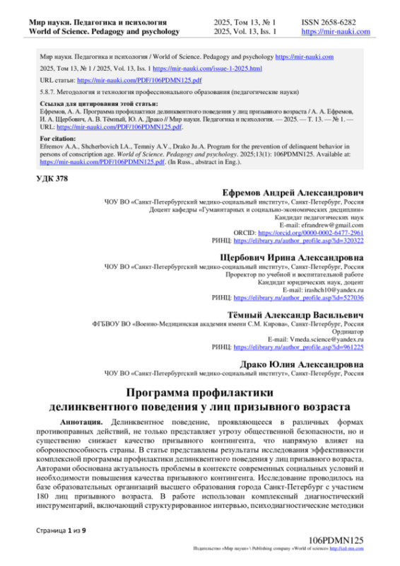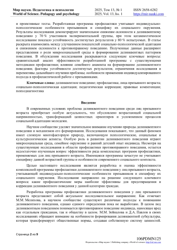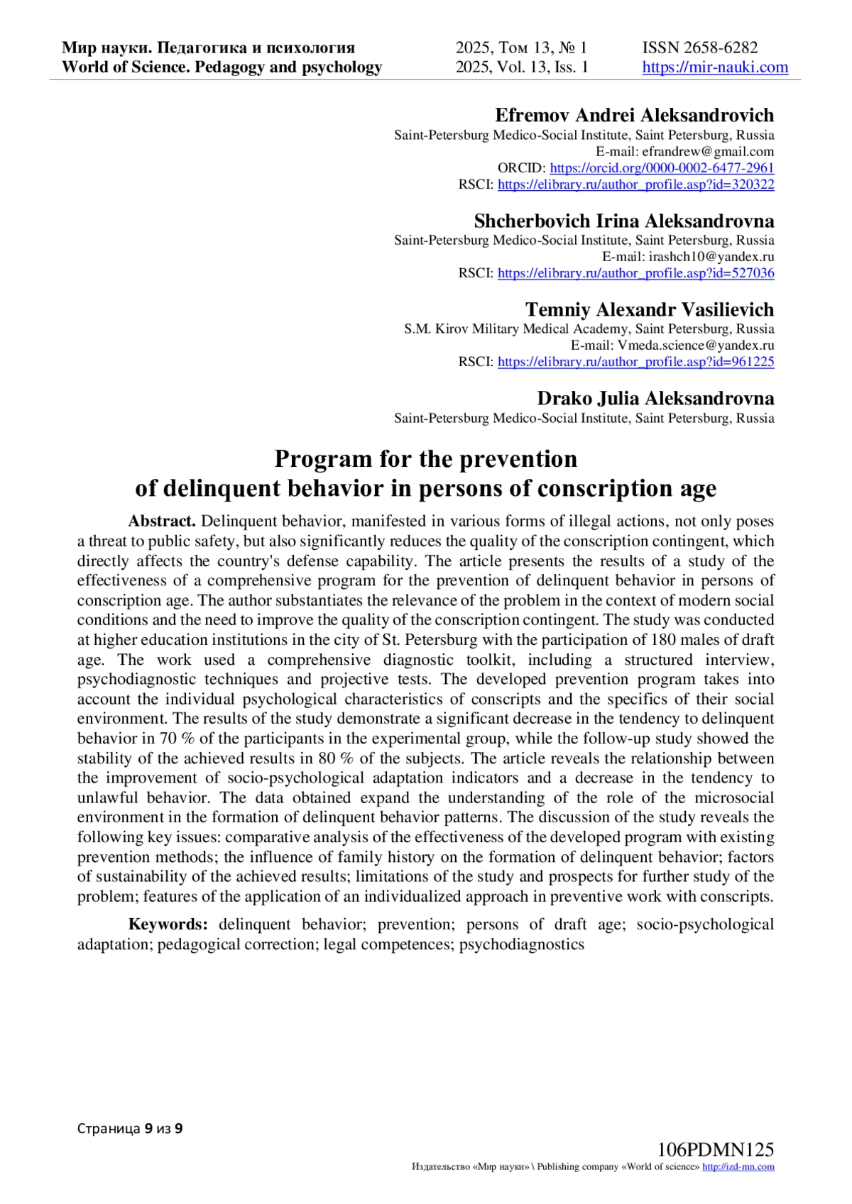 Делинквентное поведение, проявляющееся в различных формах противоправных действий, не только представляет угрозу общественной безопасности, но и существенно снижает качество призывного контингента, что напрямую влияет на обороноспособность страны. В статье представлены результаты исследования эффективности комплексной программы профилактики делинквентного поведения у лиц призывного возраста. Авторами обоснована актуальность проблемы в контексте современных социальных условий и необходимости повышения качества призывного контингента. Исследование проводилось на базе образовательных организаций высшего образования города Санкт-Петербург с участием 180 лиц призывного возраста. В работе использован комплексный диагностический инструментарий, включающий структурированное интервью, психодиагностические методики и проективные тесты. Разработанная программа профилактики учитывает индивидуально-психологические особенности призывников и специфику их социального окружения. Результаты исследования демонстрируют значительное снижение склонности к делинквентному поведению у 70 % участников экспериментальной группы, при этом катамнестическое исследование показало устойчивость достигнутых результатов у 80 % испытуемых. В статье раскрыта взаимосвязь между улучшением показателей социально-психологической адаптации и снижением склонности к противоправному поведению. Полученные данные расширяют представления о роли микросоциальной среды в формировании делинквентных паттернов поведения. В обсуждении исследования раскрываются следующие ключевые вопросы: сравнительный анализ эффективности разработанной программы с существующими методиками профилактики; влияние семейного анамнеза на формирование делинквентного поведения; факторы устойчивости достигнутых результатов; ограничения исследования и перспективы дальнейшего изучения проблемы; особенности применения индивидуализированного подхода в профилактической работе с призывниками.
