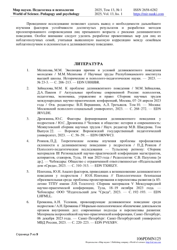1. Мелихова, М.М. Эволюция причин и условий делинквентного поведения молодежи / М.М. Мелихова // Научные труды Республиканского института высшей школы. Исторические и психолого-педагогические науки. - 2023. - № 23-3. - С. 206-213. EDN: UHHJBR