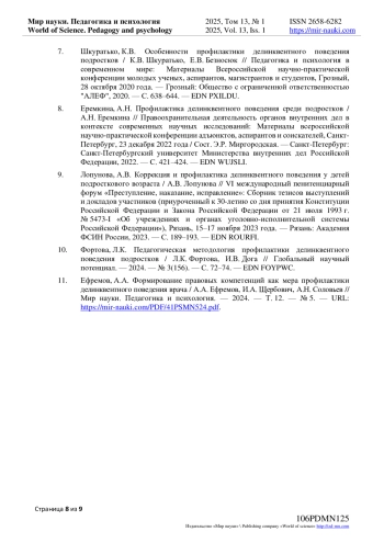 6. Еремкина, А.Н. Условия, провоцирующие делинквентное поведение среди подростков / А.Н. Еремкина // Морально-психологическое обеспечение деятельности органов внутренних дел: современные подходы и перспективы развития: Материалы всероссийской научно-практической конференции, Санкт-Петербург, 06 декабря 2023 года. - Санкт-Петербург: Санкт-Петербургский университет МВД России, 2023. - С. 220-223. EDN: PVEXBV