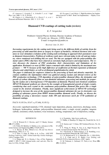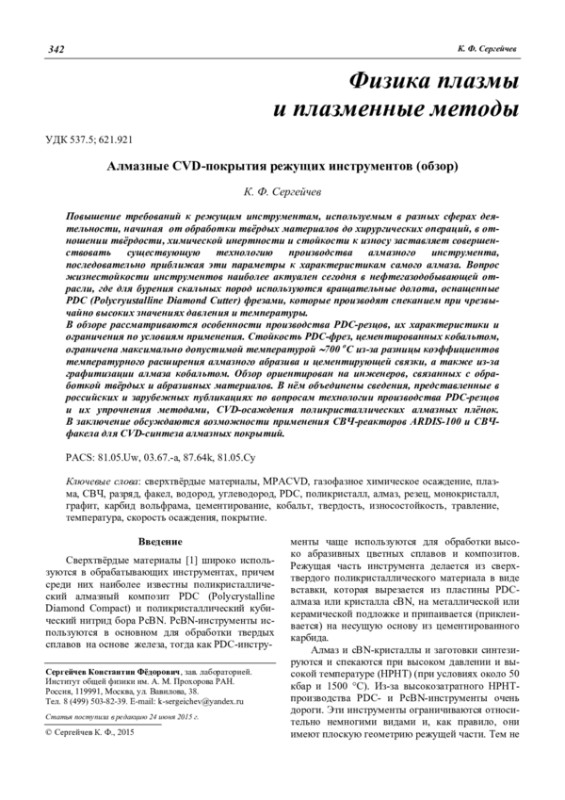 В обзоре рассматриваются особенности производства PDC-резцов, их характеристики и ограничения по условиям применения. Стойкость PDC-фрез, цементированных кобальтом, ограничена максимально допустимой температурой 700 оС из-за разницы коэффициентов температурного расширения алмазного абразива и цементирующей связки, а также из-за графитизации алмаза кобальтом. Обзор ориентирован на инженеров, связанных с обработкой твёрдых и абразивных материалов. В нём объединены сведения, представленные в российских и зарубежных публикациях по вопросам технологии производства PDC-резцов и их упрочнения методами, СVD-осаждения поликристаллических алмазных плёнок. В заключение обсуждаются возможности применения СВЧ-реакторов ARDIS-100 и СВЧфакела для CVD-синтеза алмазных покрытий.
