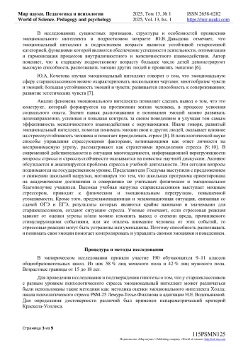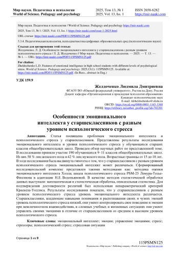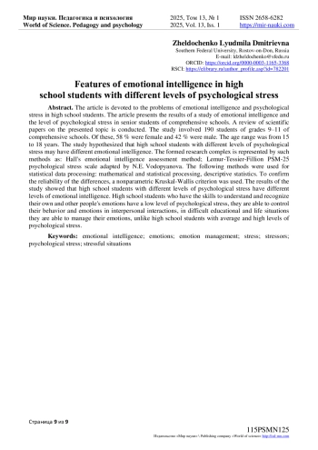 Статья посвящена проблемам эмоционального интеллекта и психологического стресса у старшеклассников. Представлены результаты исследования эмоционального интеллекта и уровня психологического стресса у обучающихся старших классов общеобразовательных школ. Проведен обзор научных работ по представленной теме. В исследовании приняли участие 190 обучающихся 9-11 классов общеобразовательных школ. Из них 58 % лиц женского пола и 42 % лиц мужского пола. Возрастные границы от 15 до 18 лет. В ходе исследования была выдвинута гипотеза о том, что у старшеклассников с разным уровнем психологического стресса эмоциональный интеллект может различаться. Сформированный исследовательский комплекс представлен такими методиками как: методика оценки эмоционального интеллекта Холла; шкала психологического стресса PSM-25 Лемура-Тесье-Филлиона в адаптации Н. Е. Водопьяновой. В качестве методов статистической обработки данных выступали: математическая и статистическая обработка, описательная статистика. Для подтверждения достоверности различий был использован непараметрический критерий Краскела-Уоллиса. Результаты исследования показали, что у старшеклассников с разным уровнем психологического стресса уровень эмоционального интеллекта различается. Старшеклассники, владеющие навыками понимания и распознавания своих и чужих эмоций уровень психологического стресса низкий, они умеют контролировать свое поведение и эмоции при межличностном взаимодействии, в сложных учебных и жизненных ситуациях они умеют управлять своими эмоциями в отличие от старшеклассников со средним и высоким уровнем психологического стресса.