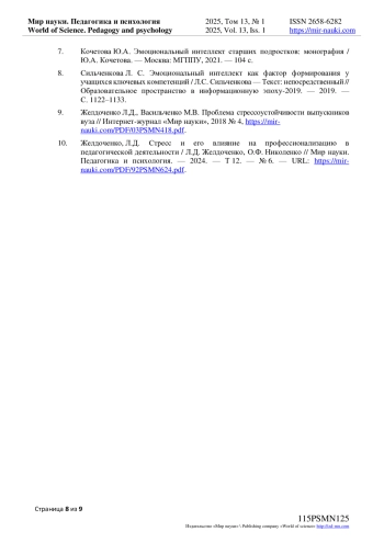 10. Желдоченко, Л.Д. Стресс и его влияние на профессионализацию в педагогической деятельности / Л.Д. Желдоченко, О.Ф. Николенко // Мир науки. Педагогика и психология. - 2024. - Т 12. - № 6. - URL: https://mir-nauki.com/PDF/92PSMN624.pdf. EDN: UBIYNV