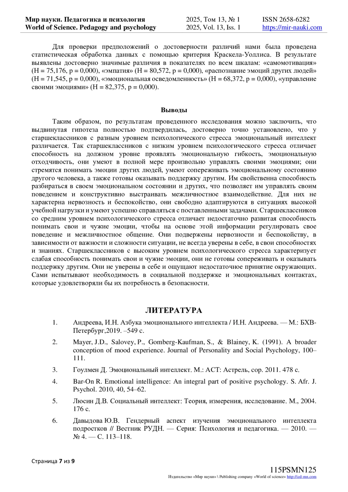 7. Кочетова Ю.А. Эмоциональный интеллект старших подростков: монография / Ю.А. Кочетова. - Москва: МГППУ, 2021. - 104 с. EDN: HMYZGX