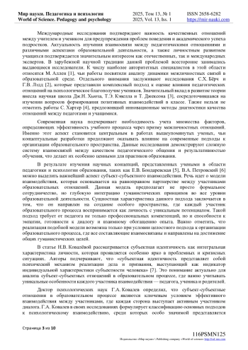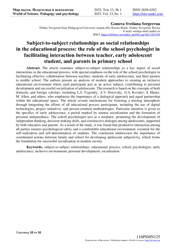 В статье рассматриваются субъектно-субъектные отношения как ключевой аспект социальных взаимодействий в образовательном процессе, особое внимание уделяется роли педагога-психолога в организации эффективного взаимодействия между педагогом, учеником младшего подросткового возраста и его родителями. Авторами представлен анализ современных подходов к формированию инклюзивной образовательной среды, где каждый участник выступает активным субъектом, что способствует личностному развитию и успешной социализации подростков. Исследование основано на концепциях отечественных и зарубежных ученых, таких как Л. С. Выготский, А. В. Петровский, Г. А. Ковалев, С. Хартер, M. Аллен и др., которые подчеркивают важность диалогового подхода и равноправного партнерства в образовательном пространстве. В статье раскрываются механизмы создания доверительной атмосферы через интеграцию усилий всех участников образовательного процесса, включая использование цифровых технологий, проектные инициативы и личностно-ориентированные методики. Основное внимание уделяется специфике младшего подросткового возраста, когда происходит интенсивная социализация и формирование самостоятельности личности. Педагог-психолог выступает медиатором, способствуя развитию навыков самостоятельного мышления, принятия решений и конструктивного диалога у подростков при поддержке как педагогов, так и родителей. В результате исследования выявлено, что продуктивное взаимодействие всех сторон обеспечивает психологическую безопасность и комфортную образовательную среду, необходимые для самореализации и самоопределения учеников. Заключение подчеркивает значимость согласованности действий семьи и школы для развития субъектности подростка, что является основой успешной социализации в современном обществе.