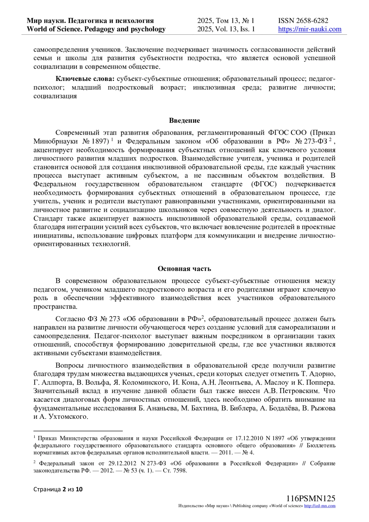 Современный этап развития образования, регламентированный ФГОС СОО (Приказ Минобрнауки № 1897) и Федеральным законом «Об образовании в РФ» № 273-ФЗ, акцентирует необходимость формирования субъектных отношений как ключевого условия личностного развития младших подростков.