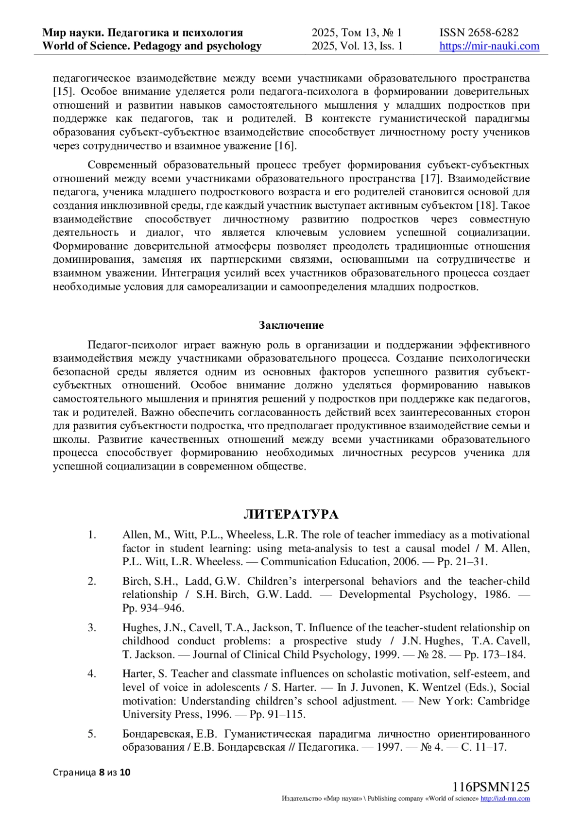 2. Birch, S.H., Ladd, G.W. Children’s interpersonal behaviors and the teacher-child relationship / S.H. Birch, G.W. Ladd. - Developmental Psychology, 1986. - Pp. 934-946.