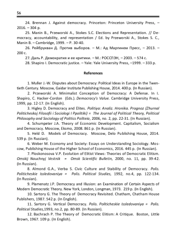 25. Manin B., Przeworski A., Stokes S.C. Elections and Representation. // Democracy, accountability, and representation / Ed. by Przeworski A., Stokes S. C., Manin B. - Cambridge, 1999. - P. 30-40.