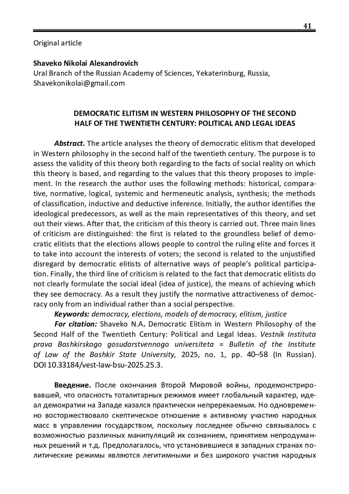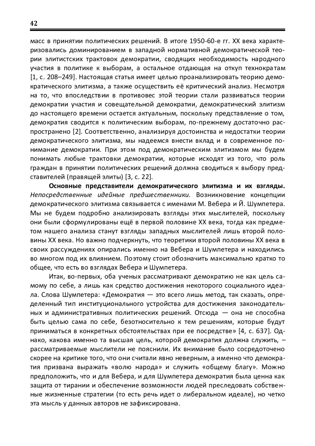 В статье осуществляется анализ теории демократического элитизма, сложившейся в западной науке во второй половине ХХ века. Целью является оценка обоснованности данной теории как с точки зрения истинности тех фактов социальной реальности, на которые эта теория опирается, так и с точки зрения ценностей, которые эта теория предлагает реализовывать. Исследование осуществлено с использованием следующих методов: исторического, сравнительного, нормативного, логического, системного и герменевтического анализа, синтеза, а также с применением методов классификации, аналогии, индуктивного и дедуктивного умозаключения. Первоначально автором определяются идейные предшественники, а также основные представители данной теории. Далее излагаются взгляды тех и других. После этого осуществляется критика указанной теории. При этом выделяются три основных линии критики: первая связана с беспочвенной верой демократических элитистов в то, что институт выборов позволяет контролировать правящую элиту и заставляет её учитывать интересы избирателей; вторая связана с необоснованным игнорированием демократическими элитистами иных, помимо выборов, способов политического участия граждан в управлении государством; наконец, третья линия критика связана с тем, что демократические элитисты недостаточно четко формулируют тот социальный идеал (представления о справедливости), средством достижения которого они видят демократию, вследствие чего нормативная привлекательность демократии обосновывается ими скорее с индивидуальной, чем с социальной перспективы