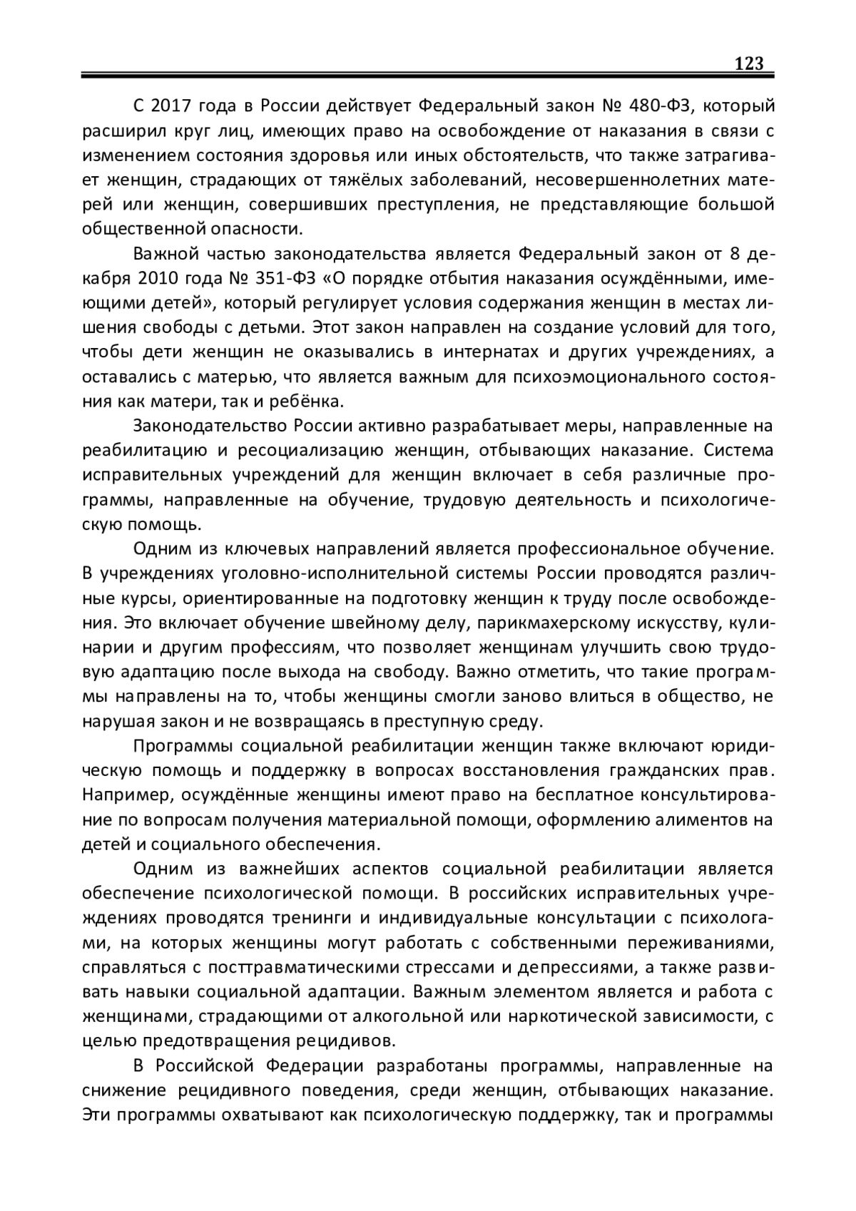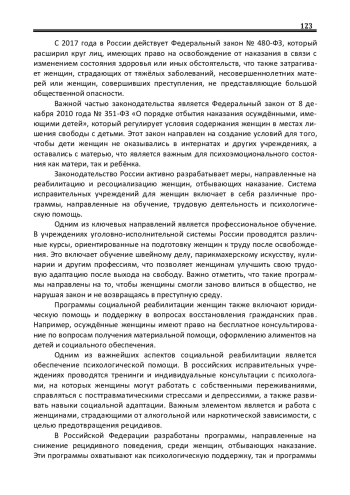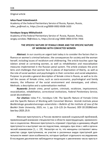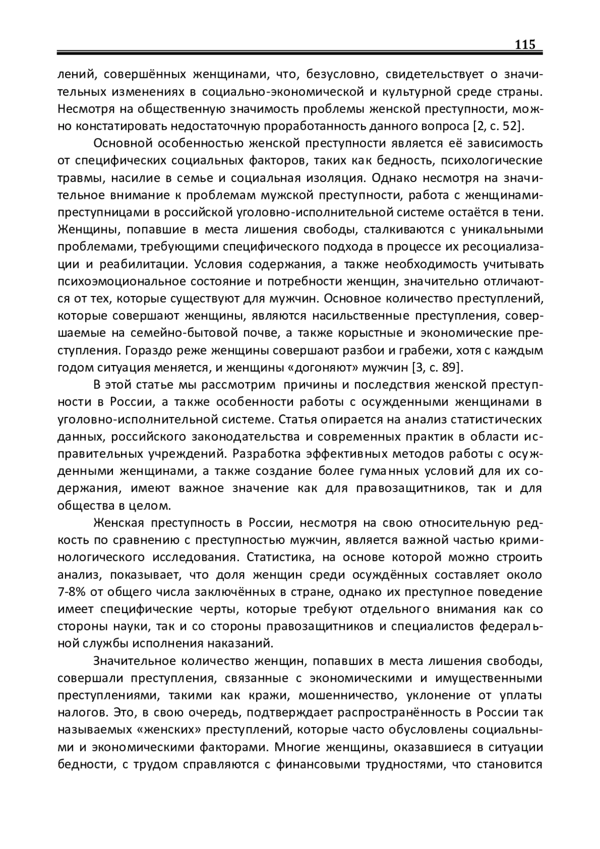 Актуальной задачей на сегодняшний день в нашей стране является рассмотрение факторов, влияющих на преступное поведение женщин и последствия для общества и самой женщины, включая вопросы рецидивного поведения и воспитания детей. Затрагивается законодательство, направленное на исправление женщин, а также меры по реабилитации и ресоциализации, реализуемым в российской УИС. Анализируются проблемы и вызовы, с которыми сталкиваются женщины в местах лишения свободы, а также роль социальных работников и психологов в их коррекции и социальной адаптации. Цель: дать общую характеристику женской преступности в России, а также подробно раскрыть причины женской преступности, такие как социальноэкономические, психологические и семейные причины, влияние социальной среды и стереотипов и другие. Методы: В данном исследовании применялись описательный метод и метод систематизации