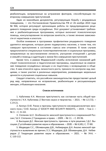 4. Высоцкая Д.С. Женская преступность: причины и пути решения / Д.С. Высоцкая // устойчивое развитие науки и образования. - 2020. - № 6 (45). С. 77-80. EDN: LENUVM