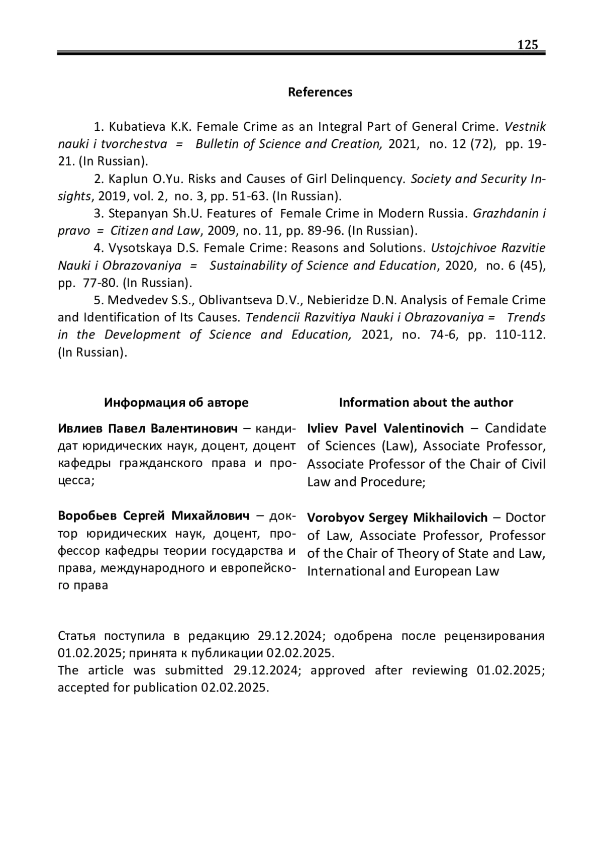 5. Медведев С.С., Обливанцева Д.В., Небиеридзе Д.Н. Анализ женской преступности и выявление ее причин / С.С. Медведев, Д.В. Обливанцева, Д.Н. Небиеридзе // Тенденции развития науки и образования. - 2021. - № 74-6. - С. 110-112. EDN: WYEWPM