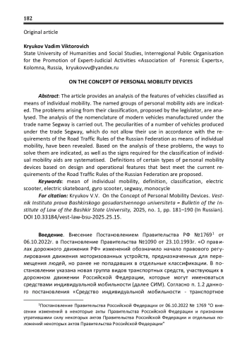 В статье приведен анализ особенностей транспортных средств, отнесенных к категории средств индивидуальной мобильности. Указаны поименованные группы видов средств индивидуальной мобильности. Проанализированы проблемы, возникающие при их классификации, предложенной законодателем. Проведен анализ номенклатуры современных транспортных средств, выпускаемых под торговым названием Segway. Выявлены особенности ряда транспортных средств, выпускаемых под торговым названием Segway, не допускающих их использование согласно требованиям Правил дорожного движения РФ в качестве средств индивидуальной мобильности. На основе анализа указанных проблем предложены пути их решения, а также систематизированы признаки, требуемые для классификации средств индивидуальной мобильности. Предложены определения отдельных видов средств индивидуальной мобильности исходя из конструктивных и эксплуатационных особенностей, наиболее удовлетворяющие действующим требованиям Правил дорожного движения РФ.