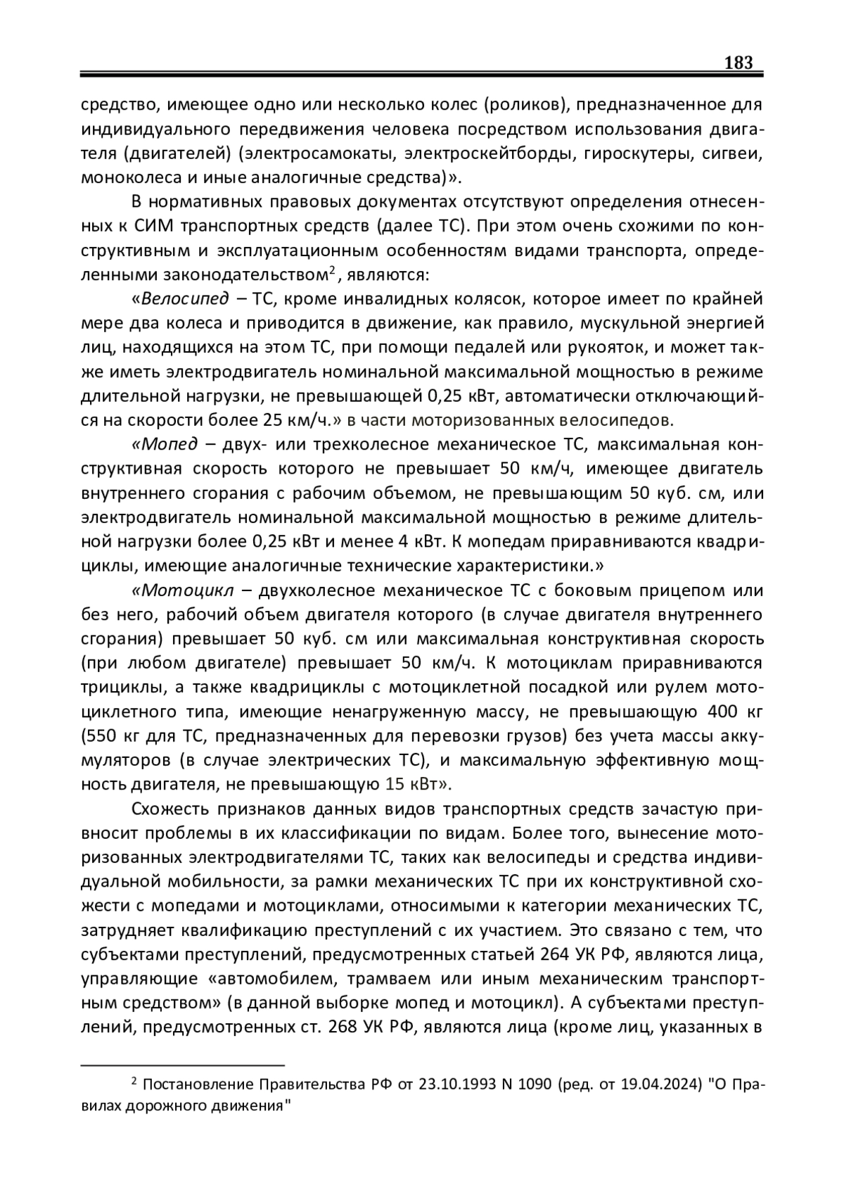 Введение. Внесение Постановлением Правительства РФ No17691 от 06.10.2022г. в Постановление Правительства No1090 от 23.10.1993г. «О правилах дорожного движения РФ» изменений обозначило начало правового регулирования движения моторизованных устройств, предназначенных для перемещения людей, но ранее не попадавших в отдельные классификации. В постановлении указана новая группа видов транспортных средств, участвующих в дорожном движении Российской Федерации, которые могут именоваться средствами индивидуальной мобильности (далее СИМ).