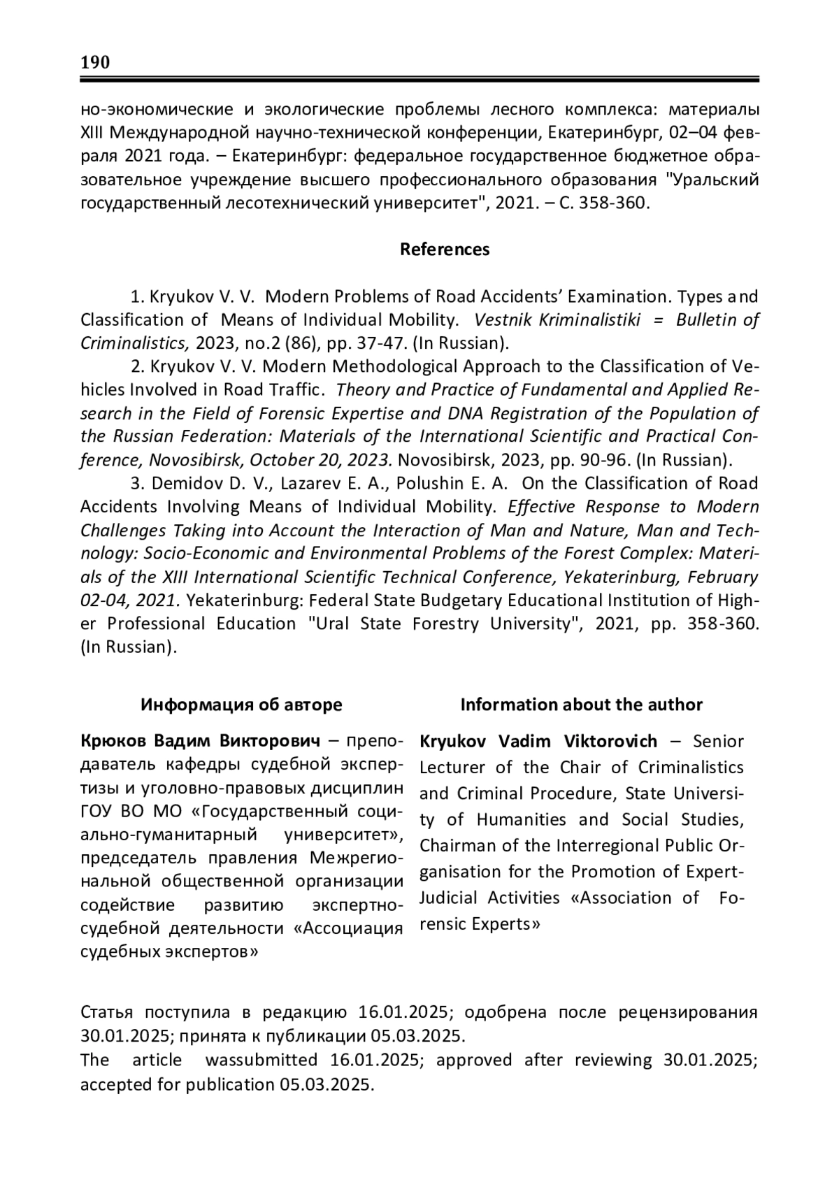 1. Крюков, В.В. Современные проблемы экспертизы дорожно-транспортных происшествий. Виды и классификация средств индивидуальной мобильности / В. В. Крюков // Вестник криминалистики. - 2023. - № 2(86). - С. 37-47. EDN: MRMXYG