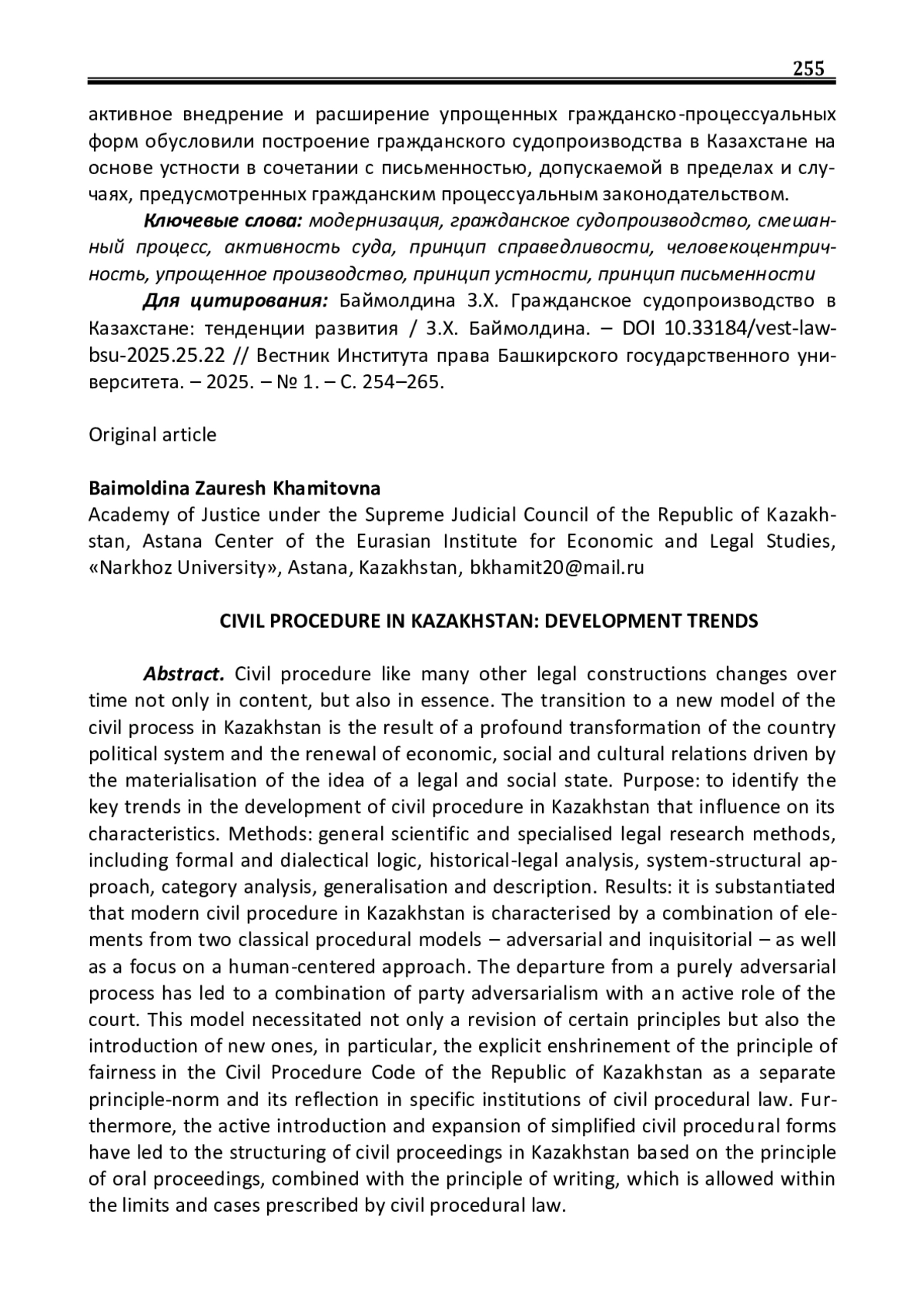 Гражданское судопроизводство, как и многие другие юридические конструкции, с течением времени изменяется не только содержательно, но и сущностно. Наметившийся в Казахстане переход к новой модели гражданского процесса является результатом глубокой трансформации политической системы страны, обновления экономических, социальных и культурных отношений, обусловленных материализацией идеи правового и социального государства. Цель: раскрыть основные тенденции развития казахстанского судопроизводства по гражданским делам, влияющие на его характеристику. Методы: общенаучные и специальные методы правовых исследований: формальной и диалектической логики, историко-юридический, системноструктурный, анализ отдельных категорий, обобщение, описание. Результаты: обосновывается, что современное гражданское судопроизводство в Казахстане характеризуется сочетанием элементов двух классических моделей процесса – состязательного и следственного, а также ориентированностью на человекоцентричность. Отход от состязательного процесса в чистом виде привел к сочетанию состязательности сторон с активной ролью суда. Такая модель процесса потребовала не только пересмотра содержания отдельных принципов, но и предполагает введение новых, в частности, прямого закрепления в ГПК РК принципа справедливости в виде отдельной нормы-принципа и отражения его в отдельных институтах гражданского процессуального права. Наряду с этим активное внедрение и расширение упрощенных гражданско-процессуальных форм обусловили построение гражданского судопроизводства в Казахстане на основе устности в сочетании с письменностью, допускаемой в пределах и случаях, предусмотренных гражданским процессуальным законодательством