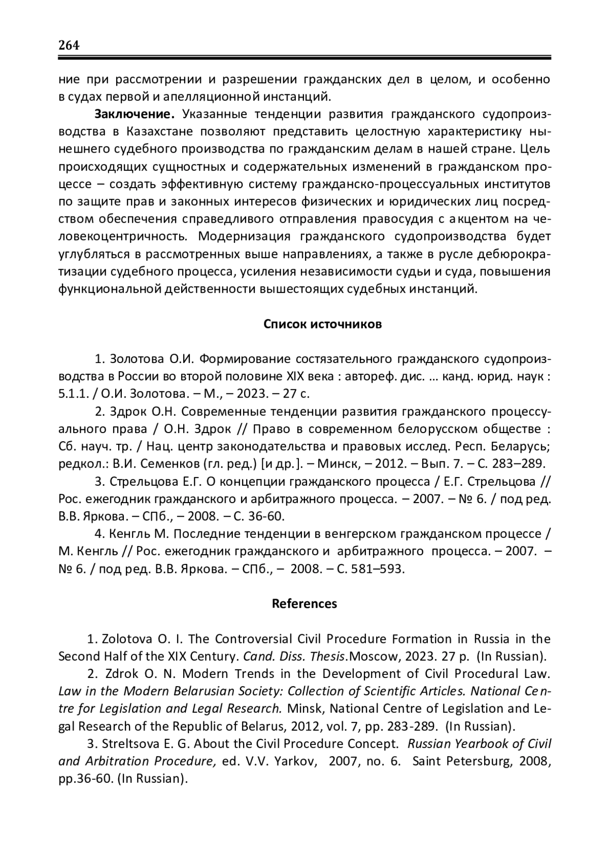 1. Золотова О.И. Формирование состязательного гражданского судопроизводства в России во второй половине XIX века: автореф. дис. … канд. юрид. наук: 5.1.1. / О.И. Золотова. - М., - 2023. - 27 с. EDN: PIINUT