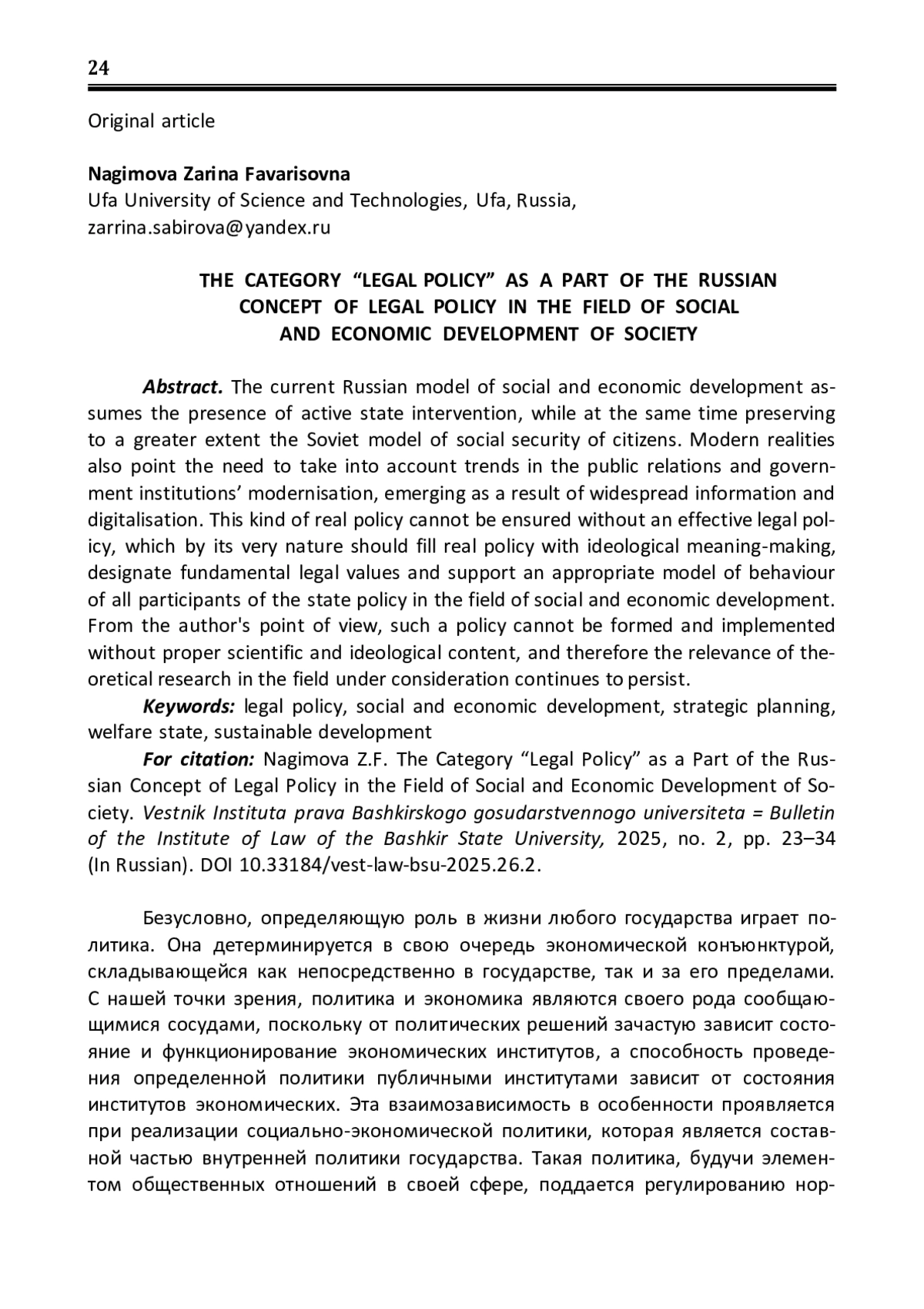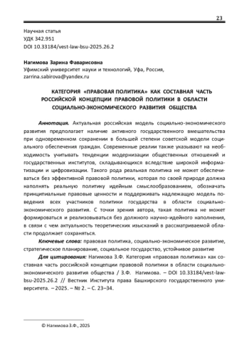 Актуальная российская модель социально-экономического развития предполагает наличие активного государственного вмешательства при одновременном сохранении в большей степени советской модели социального обеспечения граждан. Современные реалии также указывают на необходимость учитывать тенденции модернизации общественных отношений и государственных институтов, складывающихся вследствие широкой информатизации и цифровизации. Такого рода реальная политика не может обеспечиваться без эффективной правовой политики, которая по своей природе должна наполнять реальную политику идейным смыслообразованием, обозначать принципиальные правовые ценности и поддерживать надлежащую модель поведения всех участников политики государства в области социальноэкономического развития. С точки зрения автора, такая политика не может формироваться и реализовываться без должного научно-идейного наполнения, в связи с чем актуальность теоретических изысканий в рассматриваемой области продолжает сохраняться