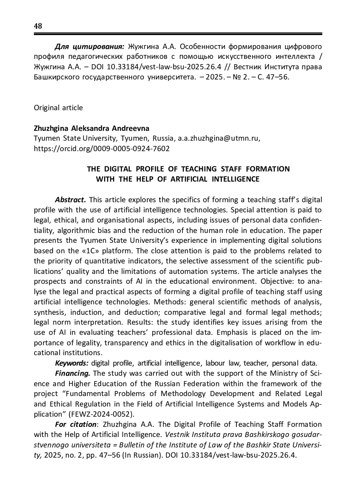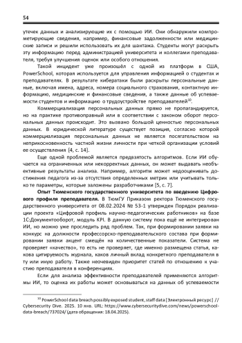 В статье рассматриваются особенности формирования цифрового профиля преподавателя с применением технологий искусственного интеллекта. Основное внимание уделяется правовым, организационным и этическим аспектам, в том числе вопросам конфиденциальности персональных данных, рискам предвзятости алгоритмов и снижению роли человеческого фактора в кадровых решениях. Приводится опыт Тюменского государственного университета, в котором осуществляется внедрение цифровых решений на базе платформы «1С: Документооборот». Пристальное внимание уделено проблемам, связанным с приоритетом количественных показателей, избирательной оценкой качества научных публикаций и ограничениями автоматизированных систем. Анализируются перспективы и вызовы, связанные с использованием ИИ в образовательной среде. Цель: проанализировать правовые и прикладные аспекты формирования цифрового профиля педагогических работников с использованием технологий искусственного интеллекта. Методы: общенаучные методы анализа, синтеза, индукции и дедукции; сравнительно-правовой и формально-юридический методы; интерпретация правовых норм. Результаты: выявлены ключевые проблемы, возникающие при использовании искусственного интеллекта в анализе профессиональных данных преподавателей. Сделан акцент на необходимости соблюдения законности, транспарентности и этики при цифровизации трудовых процессов в образовательных организациях