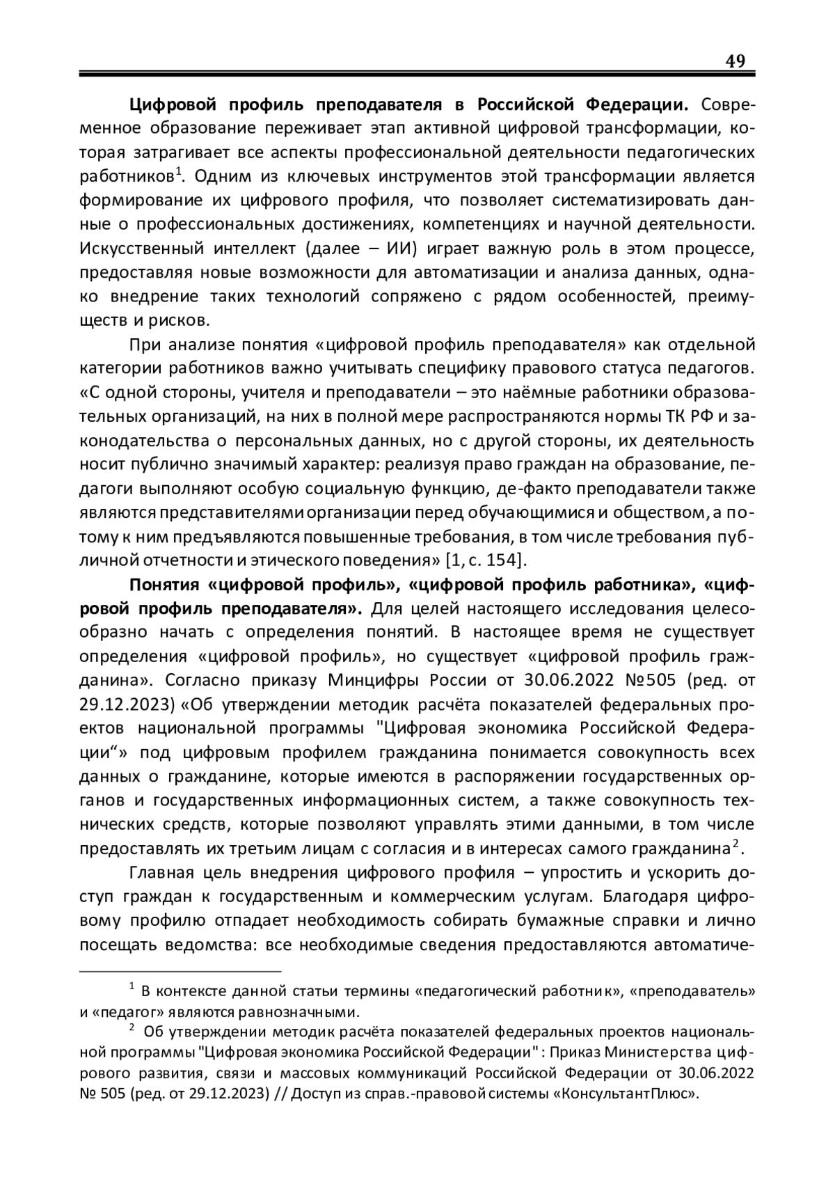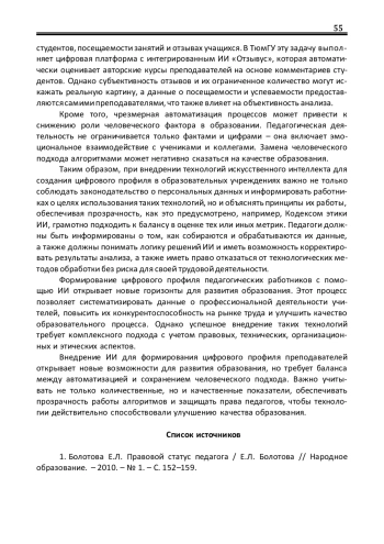 Цифровой профиль преподавателя в Российской Федерации. Современное образование переживает этап активной цифровой трансформации, которая затрагивает все аспекты профессиональной деятельности педагогических работников1. Одним из ключевых инструментов этой трансформации является формирование их цифрового профиля, что позволяет систематизировать данные о профессиональных достижениях, компетенциях и научной деятельности. Искусственный интеллект (далее – ИИ) играет важную роль в этом процессе, предоставляя новые возможности для автоматизации и анализа данных, однако внедрение таких технологий сопряжено с рядом особенностей, преимуществ и рисков