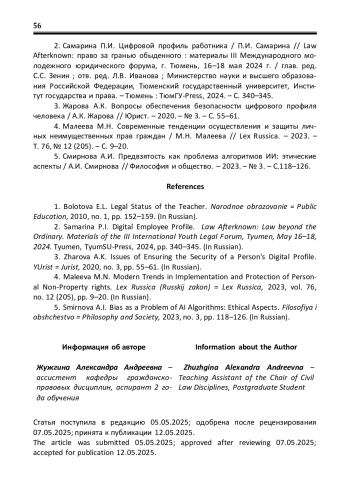 2. Самарина П.И. Цифровой профиль работника / П.И. Самарина // Law Afterknown: право за гранью обыденного: материалы III Международного молодежного юридического форума, г. Тюмень, 16-18 мая 2024 г. / глав. ред. С.С. Зенин; отв. ред. Л.В. Иванова; Министерство науки и высшего образования Российской Федерации, Тюменский государственный университет, Институт государства и права. - Тюмень: ТюмГУ-Press, 2024. - С. 340-345. EDN: LQMSJA