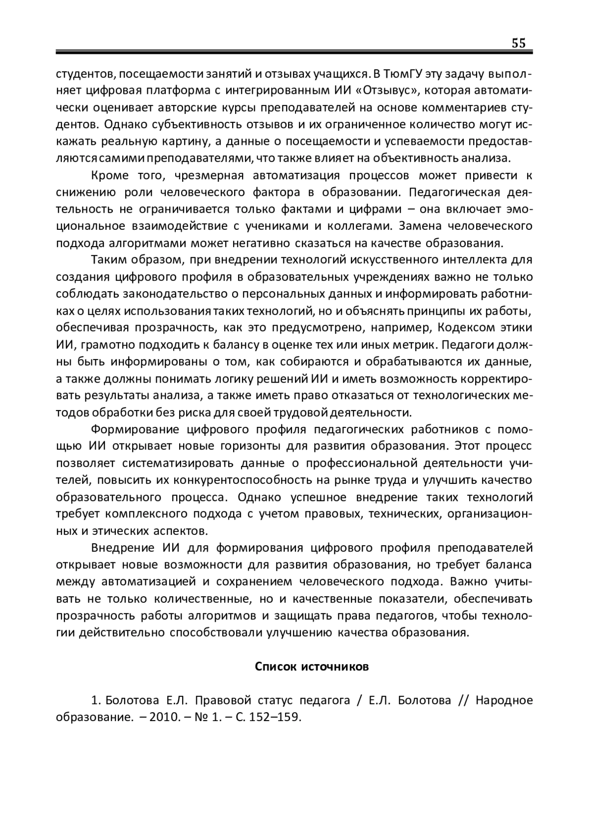1. Болотова Е.Л. Правовой статус педагога / Е.Л. Болотова // Народное образование. - 2010. - № 1. - С. 152-159. EDN: PJXQVP