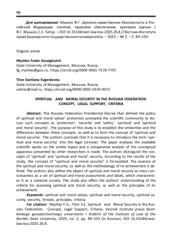 Указ Президента РФ, определивший политику защиты духовно-нравственных ценностей, побудил научное сообщество к дискуссии о понятиях «защита», «защищенность» и «безопасность», «духовная» и «духовно-нравственная безопасность». Цель настоящего исследования заключается в установлении схожести и различий этих понятий, а также в формировании понятия «духовно-нравственная безопасность». Авторами сформулирован вывод о том, что любая защита должна иметь логическое завершение, которое определяется понятиями «защищённость» или «безопасность». Логичным становится вывод о необходимости введения в правовой оборот термина «духовнонравственная безопасность». В работе проанализированы имеющиеся научные труды по рассматриваемой и близкой тематике, проведен сравнительный анализ понятийного аппарата, представленного другими исследователями. Авторы разграничивают понятия «духовная» и «духовно-нравственная» безопасность. По результатам исследования сформулировано авторское понятие «духовнонравственной безопасности». Авторами определена сущность духовнонравственной безопасности, а также методология ее достижения. Объектом духовно-нравственной безопасности авторами определено массовое сознание как совокупность духовно-нравственных оценок и идеалов, которая характеризует его как сплоченное общество. В исследовании также предлагается авторское понимание критериев оценки духовно-нравственной безопасности, а также принципы ее достижения.