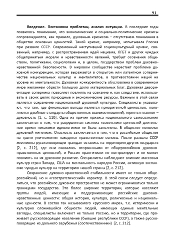 Введение. Постановка проблемы, анализ ситуации. В последние годы появилось понимание, что экономические и социально-политические кризисы сопровождаются, как правило, духовным кризисом – отсутствием понимания в обществе основных ценностей. Такой кризис, например, испытывала Россия при развале СССР. Современный наступивший социокультурный кризис, связанный, например, с распространением идей нацизма, ЛГБТ и других чуждых общепринятым морали и нравственности явлений, требует осознания обществом, политиками, социологами и, в целом, государством проблем духовнонравственной безопасности. В мировом сообществе нарастает проблема духовной конкуренции, которая выражается в открытом или латентном соперничестве национальных культур и менталитетов, в противостоянии наций на уровне их ментальности.