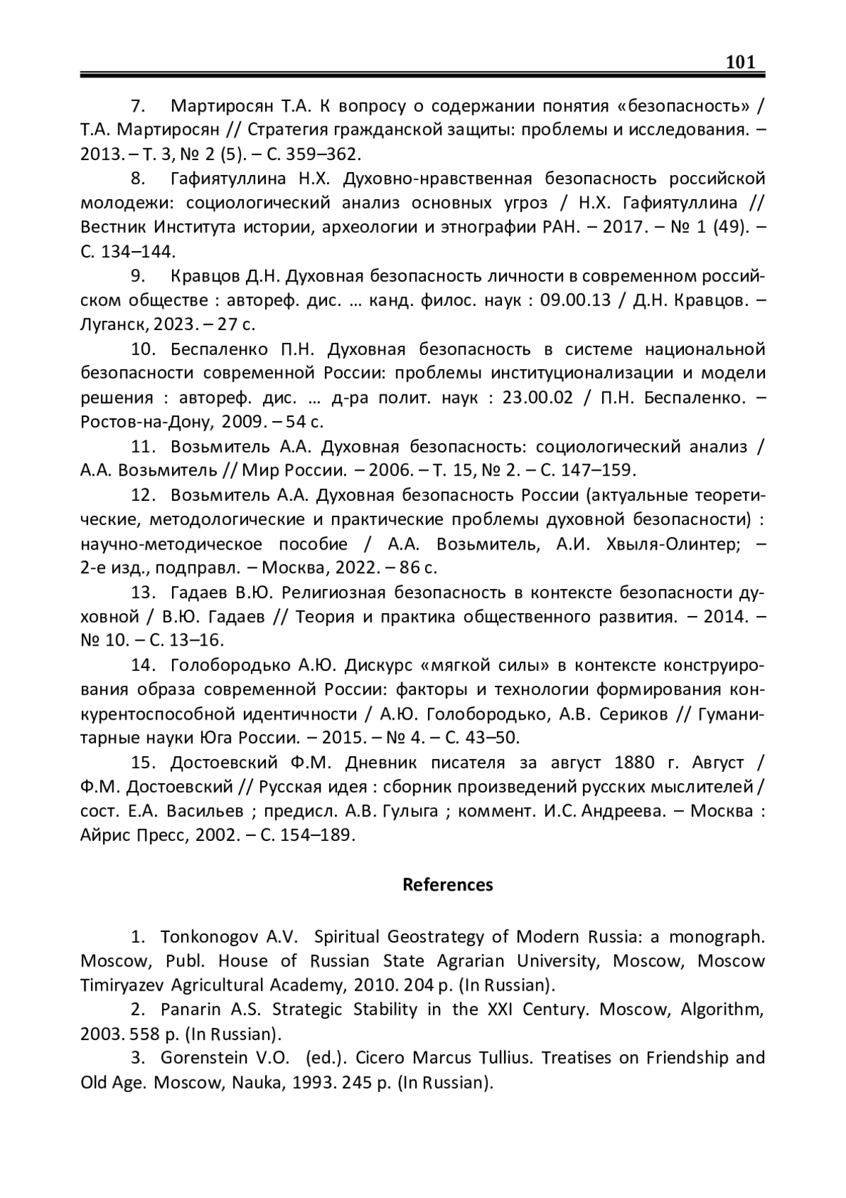 9. Кравцов Д.Н. Духовная безопасность личности в современном российском обществе: автореф. дис. … канд. филос. наук: 09.00.13 / Д.Н. Кравцов. - Луганск, 2023. - 27 с. EDN: HTKJAF