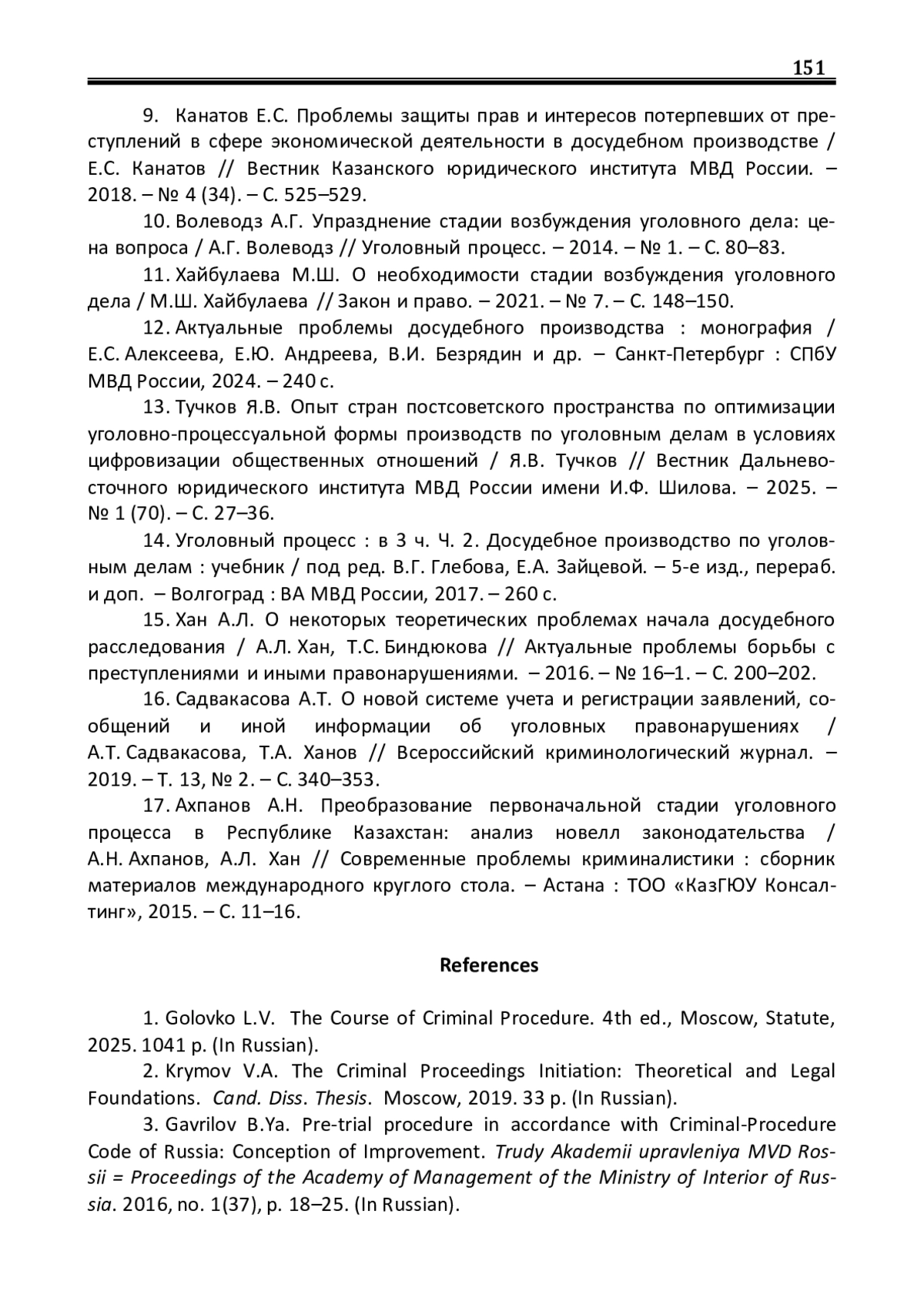 16. Садвакасова А.Т. О новой системе учета и регистрации заявлений, сообщений и иной информации об уголовных правонарушениях / А.Т. Садвакасова, Т.А. Ханов // Всероссийский криминологический журнал. - 2019. - Т. 13, № 2. - С. 340-353. EDN: EKUXDK