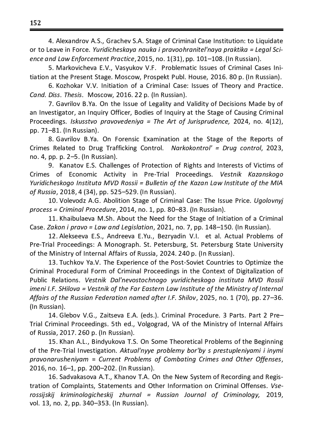 7. Гаврилов Б.Я. К вопросу законности и обоснованности решений следователя, дознавателя, органов дознания в стадии возбуждения уголовного дела / Б.Я. Гаврилов // Искусство правоведения. - 2024. - № 4 (12). - С. 71-81. EDN: UDVVCO