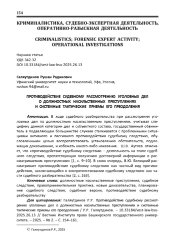 В ходе судебного разбирательства при рассмотрении уголовных дел по должностным насильственным преступлениям, учитывая специфику данной категории дел и субъектного состава, государственный обвинитель в подавляющем большинстве случаев сталкивается с проблемными ситуациями активного и пассивного противодействия судебному следствию, обусловленными целью воспрепятствовать установлению обстоятельств, подлежащих доказыванию, и избежать какого-либо наказания. Ш. В. Аутлев отмечает, что «противодействие судебному следствию – деятельность на этапе судебного следствия, препятствующая получению достоверной информации о рассматриваемом преступлении» [1, c. 9–10]. В свою очередь, В. Ю. Белицкий рассматривает противодействие судебному следствию как частный вид противодействия, заключающийся в воспрепятствовании судебному следствию как части судебного разбирательства