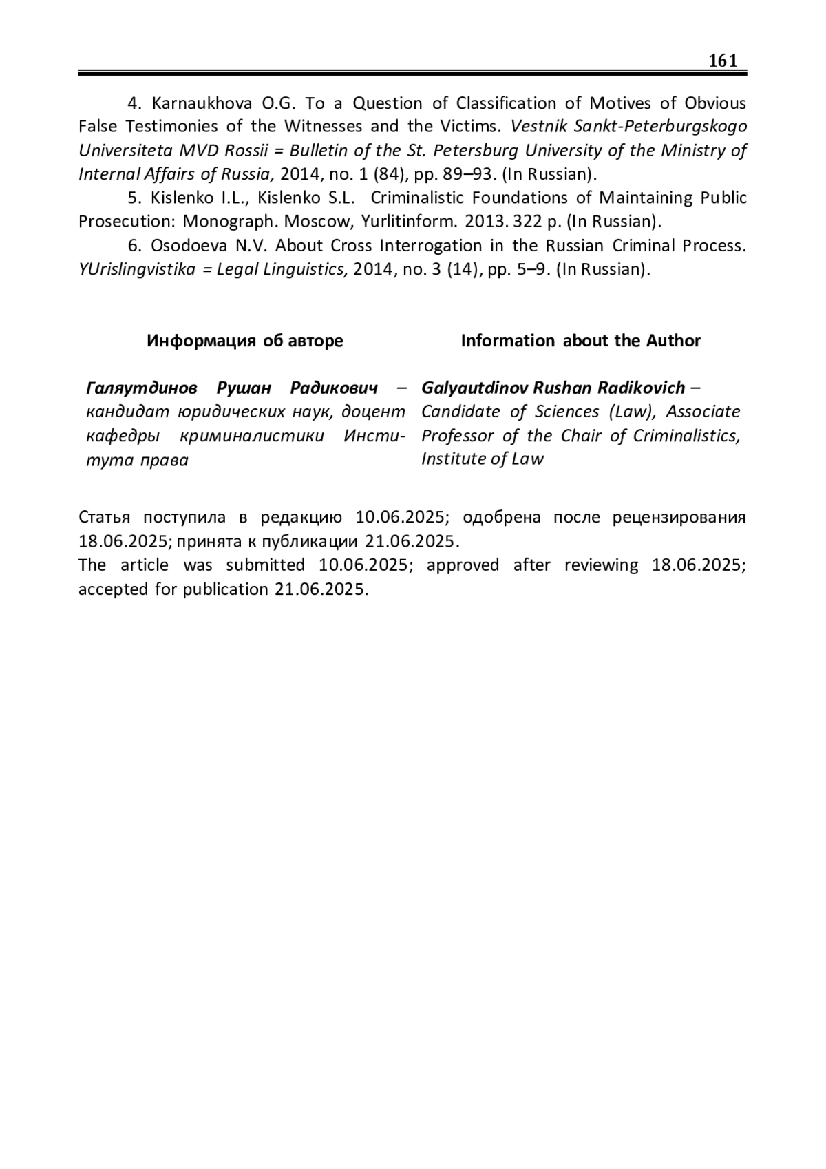 4. Карнаухова О.Г. К вопросу о классификации мотивов заведомо ложных показаний свидетелей и потерпевших / О.Г. Карнаухова // Вестник Санкт-Петербургского университета МВД России. - 2014. - № 1 (61). - С. 89-93. EDN: SFDXJV
