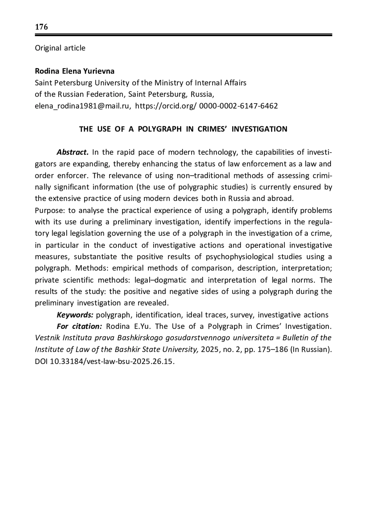 8. Рудая М.Б. Актуальные вопросы, связанные с применением полиграфа при расследовании преступлений / М.Б. Рудая, К.С. Россомахина // Молодой ученый. - 2019. - № 20 (258). - С. 358-359. EDN: YALSEJ