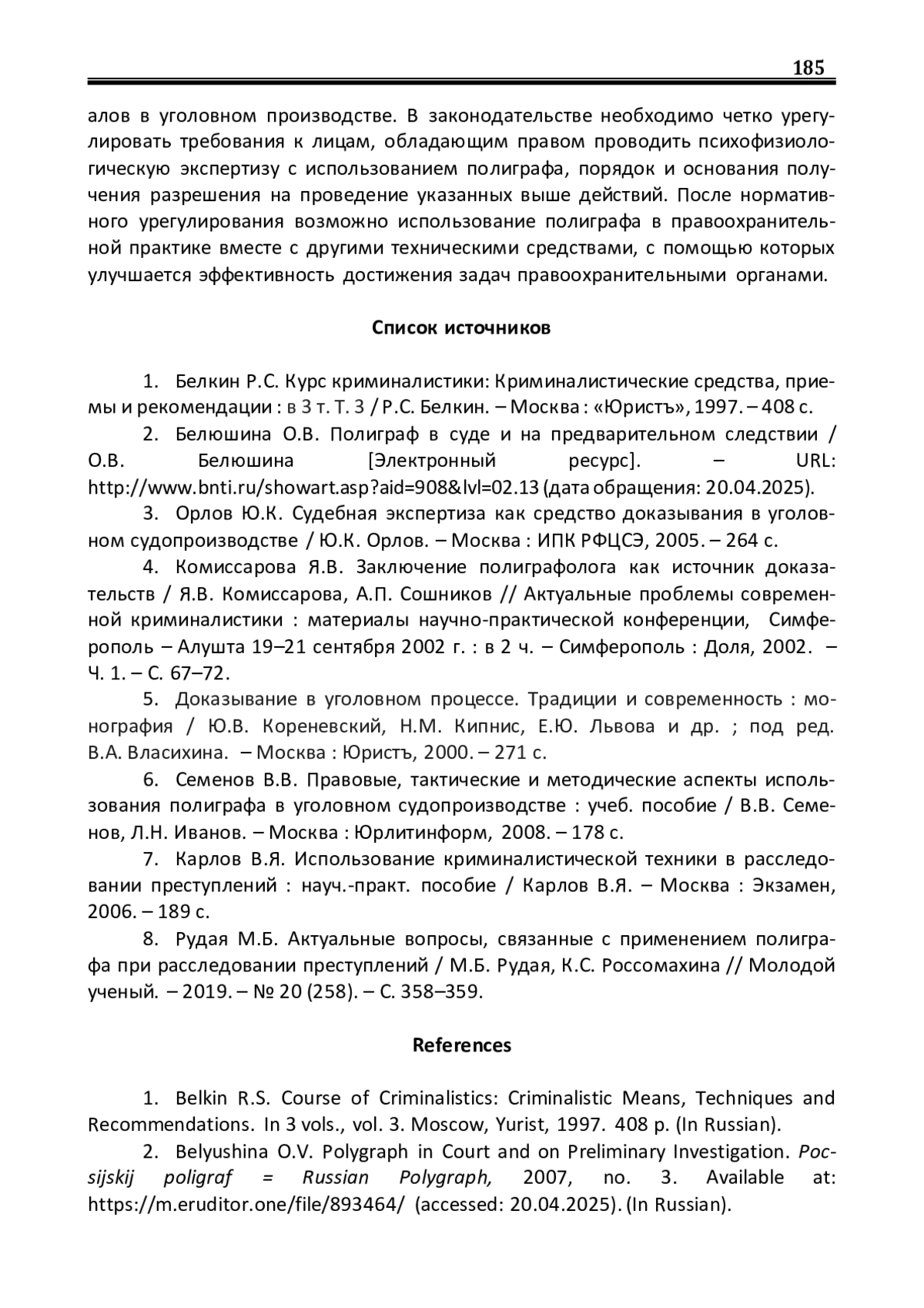 2. Белюшина О.В. Полиграф в суде и на предварительном следствии / О.В. Белюшина [Электронный ресурс]. - URL: http://www.bnti.ru/showart.asp?aid=908&lvl=02.13 (дата обращения: 20.04.2025).