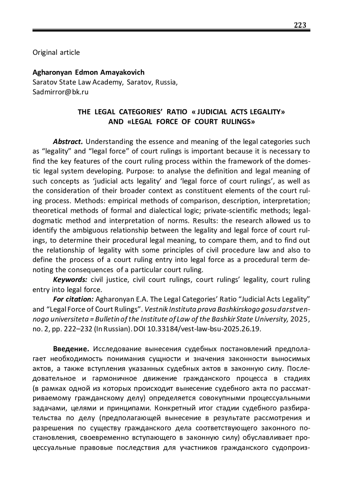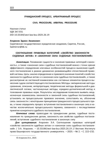 Понимание сущности и значения правовых категорий «законность», а также «законная сила» судебных постановлений важно с точки зрения эффективного определения ключевых особенностей процесса вынесения судебного постановления в рамках динамично развивающейся отечественной правовой системы. Цель: анализ определения и правового значения понятий «свойство законности судебных актов» и «законная сила судебных постановлений», а также рассмотрение их системной взаимосвязи как составных элементов процесса вынесения судом соответствующего постановления. Методы: эмпирические методы сравнения, описания, интерпретации; теоретические методы формальной и диалектической логики; частнонаучные методы; юридико-догматический метод и толкования правовых норм. Результаты: исследование позволило выявить неоднозначную взаимосвязь законности и законной силы судебных постановлений, установить их процессуальное правовое значение, сопоставить их, обозначив связь законности с некоторыми принципами гражданского процессуального права, а также определить процесс вступления постановления в законную силу в качестве исключительно процессуального термина, связанного с последствиями принятия конкретного судебного постановления