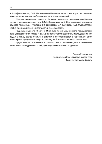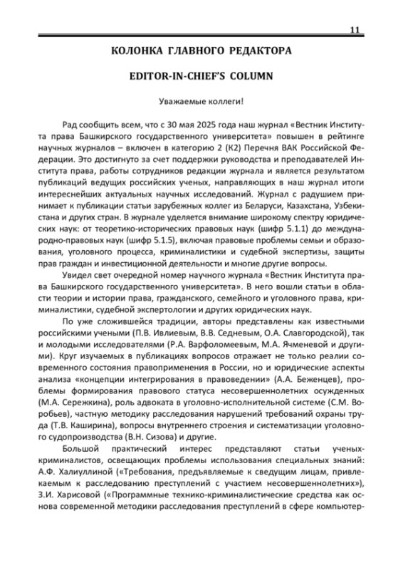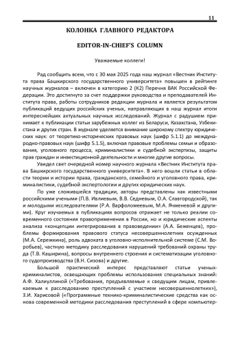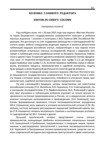 Рад сообщить всем, что с 30 мая 2025 года наш журнал «Вестник Института права Башкирского государственного университета» повышен в рейтинге научных журналов – включен в категорию 2 (К2) Перечня ВАК Российской Федерации. Это достигнуто за счет поддержки руководства и преподавателей Института права, работы сотрудников редакции журнала и является результатом публикаций ведущих российских ученых, направляющих в наш журнал итоги интереснейших актуальных научных исследований. Журнал с радушием принимает к публикации статьи зарубежных коллег из Беларуси, Казахстана, Узбекистана и других стран. В журнале уделяется внимание широкому спектру юридических наук: от теоретико-исторических правовых наук (шифр 5.1.1) до международно-правовых наук (шифр 5.1.5), включая правовые проблемы семьи и образования, уголовного процесса, криминалистики и судебной экспертизы, защиты прав граждан и инвестиционной деятельности и многие другие вопросы