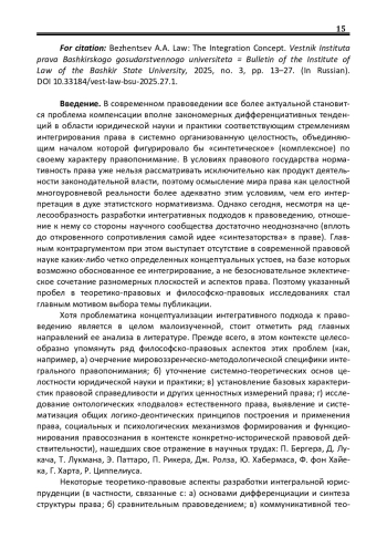 С развитием и усложнением системы общественных отношений растет степень многомерности и неоднородности феномена права как одного из главных социорегулятивных факторов. В то же время перманентно углубляющаяся его внутренняя дифференциация вызывает все более существенные трудности в согласовании с определенной обобщенной «смысловой идеей права» различных типов правопонимания, методологических подходов к познанию правовой реальности, отраслевых спецификаций регулирования отдельных сфер правоотношений. Это, в свою очередь, негативно сказывается на действенности правовых институтов как средствах гармонизации разнонаправленных субъективных интересов, поскольку становится все труднее привести их к тем или иным общим измерениям. Публикация содержит: а) систематизированный анализ основных противоречий классического правопонимания, которые до сих пор способствуют углублению теоретико-мировоззренческой и методологической «разорванности» юриспруденции; б) исследование исторических источников и современных подходов к разработке концептуальных основ интегрирования правовой науки. Обоснован интегрально-методологический подход, в рамках которого содержание права интерпретируется как производное форм самоорганизации человеческого бытия, что может служить основой координации теоретикодогматических, онтологических, культурно-ценностных, социально-исторических, процессуально-практических плоскостей юридической науки и практики.