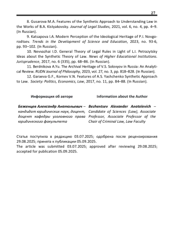 8. Гусарова М.А. Особенности синтетического подхода к пониманию права в творчестве Б.А. Кистяковского / М.А. Гусарова // Журнал юридических исследований. - 2021. - Т. 6, № 4. - С. 4-9. EDN: QEEBRL