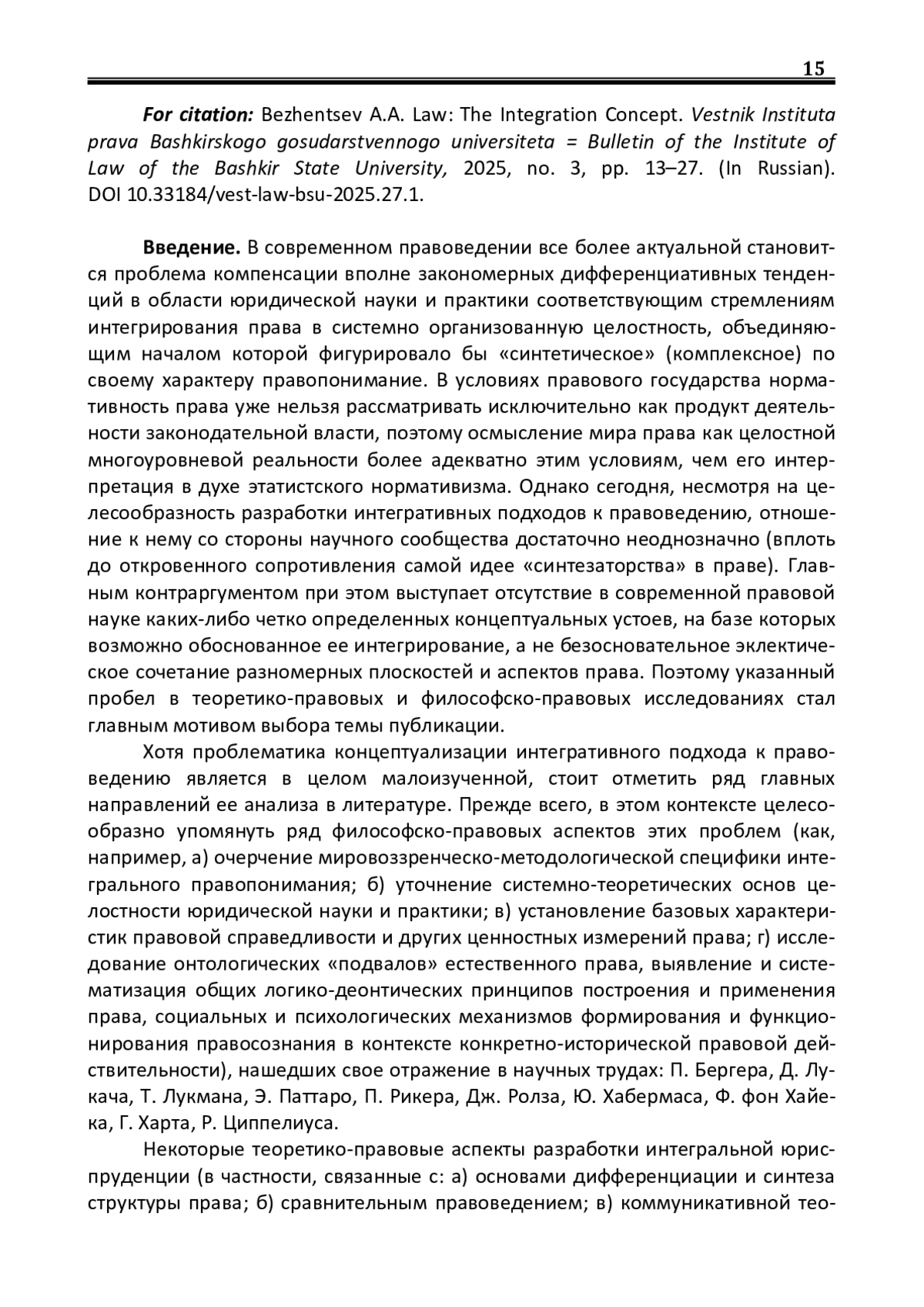 Введение. В современном правоведении все более актуальной становится проблема компенсации вполне закономерных дифференциативных тенденций в области юридической науки и практики соответствующим стремлениям интегрирования права в системно организованную целостность, объединяющим началом которой фигурировало бы «синтетическое» (комплексное) по своему характеру правопонимание. В условиях правового государства нормативность права уже нельзя рассматривать исключительно как продукт деятельности законодательной власти, поэтому осмысление мира права как целостной многоуровневой реальности более адекватно этим условиям, чем его интерпретация в духе этатистского нормативизма. Однако сегодня, несмотря на целесообразность разработки интегративных подходов к правоведению, отношение к нему со стороны научного сообщества достаточно неоднозначно (вплоть до откровенного сопротивления самой идее «синтезаторства» в праве). Главным контраргументом при этом выступает отсутствие в современной правовой науке каких-либо четко определенных концептуальных устоев, на базе которых возможно обоснованное ее интегрирование, а не безосновательное эклектическое сочетание разномерных плоскостей и аспектов права. Поэтому указанный пробел в теоретико-правовых и философско-правовых исследованиях стал главным мотивом выбора темы публикации