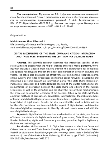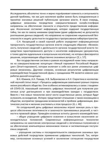 В данной научной статье проводится исследование особенностей взаимодействия Государственной Думы с гражданами через веб-сайт Государственной Думы и социальные сети, работы с индивидуальными обращениями граждан через подразделения по работе с жалобами и обращениями, а также непосредственного общения депутатов с избирателями. Кроме того, проводится оценка эффективности использования онлайн-приёмных, онлайн-опросов и видеотрансляций, осуществления мониторинга социальных сетей, разработки и совершенствования личного кабинета на информационном портале «Приёмная Государственной Думы». Цель: теоретико-методологический анализ особенностей реализации цифровых механизмов взаимодействия Государственной Думы с гражданами Российской Федерации, а также определение и исследование роли данных механизмов в процессе обеспечения законности и легитимности принимаемых решений государственного значения. Методы: эмпирические методы сравнения, описания, интерпретации; теоретические методы формальной и диалектической логики; частнонаучные методы: юридико-догматический и толкования правовых норм. Результаты: исследование позволило выявить необходимость в определении критериев эффективности взаимодействия, в установлении влияния цифровизации, в определении роли цифровых технологий и в выявлении рисков и угроз, связанных с использованием цифровых технологий